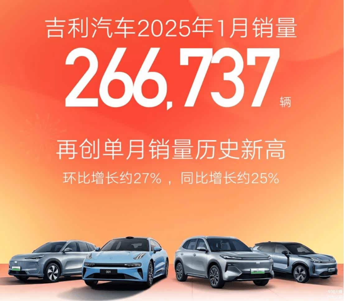 吉利汽车1月销量突破26.6万辆,再创单月销量历史新高;新能源销量突破12.1万辆,同比增长约84%。