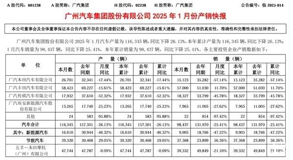 根据广汽集团发布的1月份产销快报显示,1月份广汽埃安(含昊铂)月销量为7965辆,同比下降27.62%;广汽传祺月销量为18327辆,同比下降45.78%。