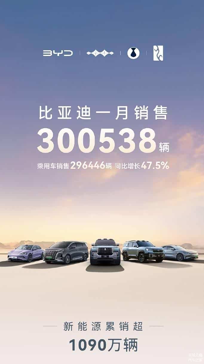 作为目前最亮眼的国产品牌,比亚迪2月2日公布了其1月份的销量成绩,1月份新车销量达到了300,538辆,实现了显著增长。其中,乘用车销售量为296,446辆,与去年同期相比增长了47.5%。