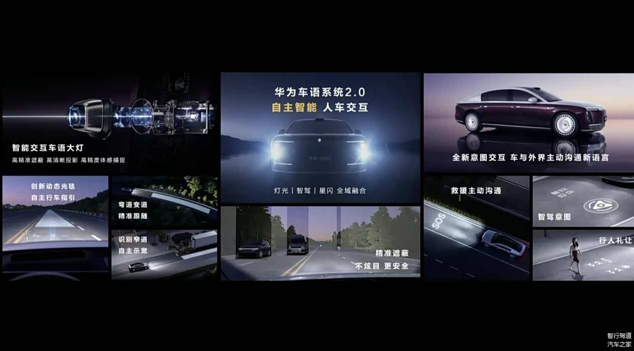 具体来说,华为车语系统2.0支持动态光毯技术,可自主调节光毯形态,跟随行车轨迹,最高支持120km/h下也能精准贴合路面。此外,当尊界S800自主识别到驾驶员失能后,还可自动靠边停车,并使用大灯投影SOS求救信号。