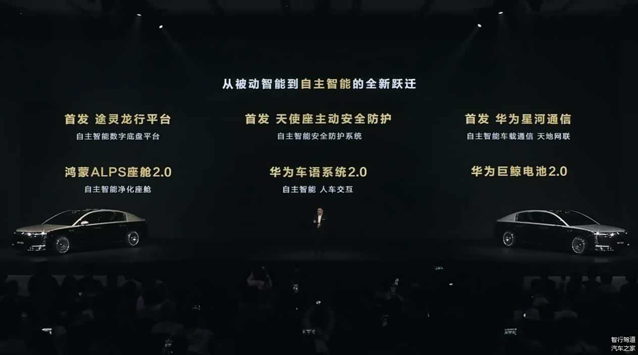 尊界S800首发搭载了六大华为技术:途灵龙行平台、天使座主动安全防护系统、华为星河通信、鸿蒙ALPS座舱2.0、华为车语系统2.0,以及华为巨鲸电池2.0。