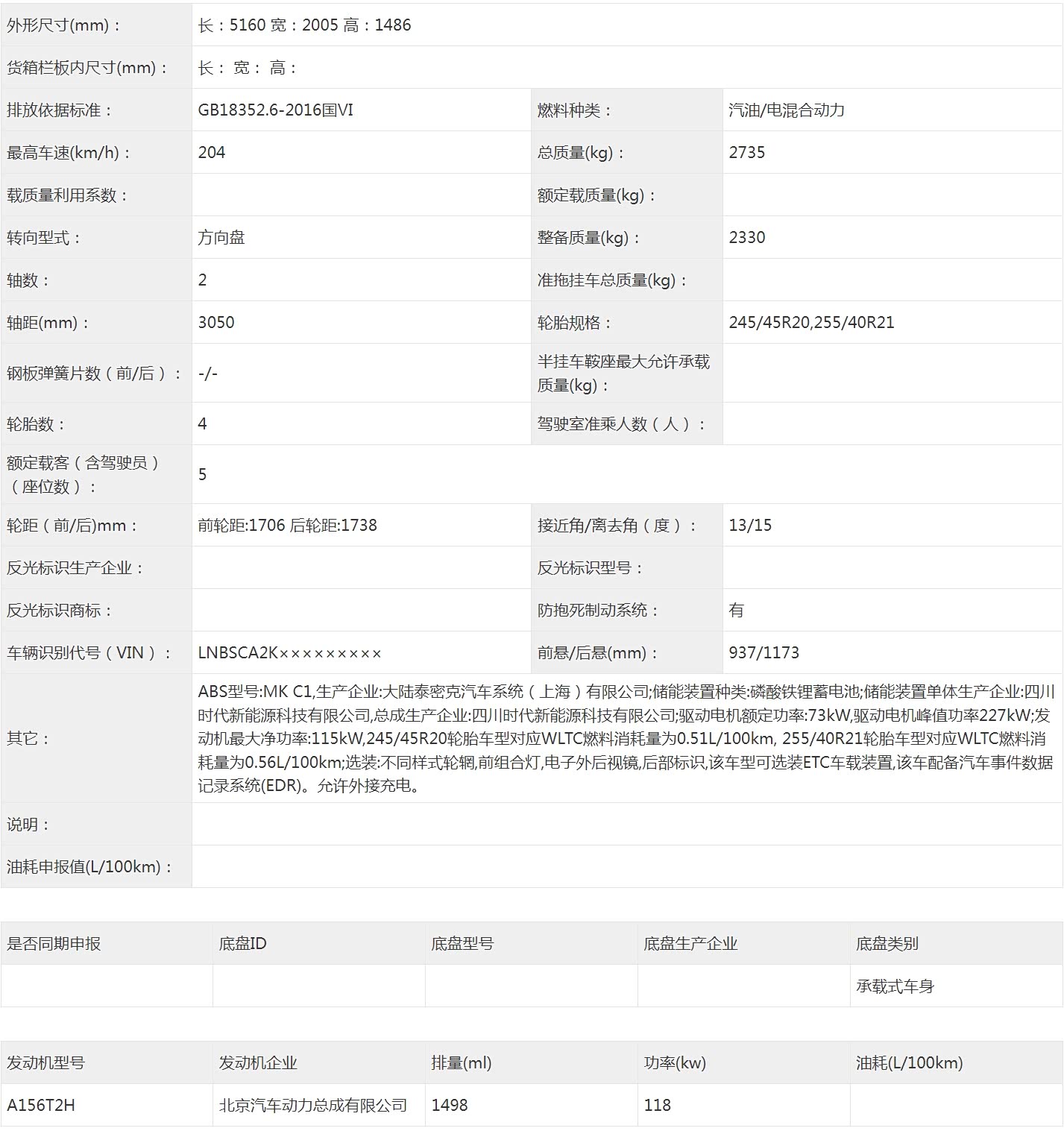 就目前的申报图来看,享界S9增程版车型外观没有多少改动,至于大家最为关注的动力总成部分,从申报信息来看,发动机是1.5TD版的,由北京汽车动力总成公司提供的A156T2H型,功率118Kw(实际最大净功率为115Kw)驱动电机峰值功率227千瓦,提供三元锂电池和磷酸铁锂电池两种电池类型,但具体的纯电续航和综合续航还有待官方进一步消息公布。油耗方面,选装245/45 R20轮胎车型对应WLTC燃料消耗量为0.51L/100km,选装255/40 R21轮胎车型对应WLTC燃料消耗量为0.56L/100km。