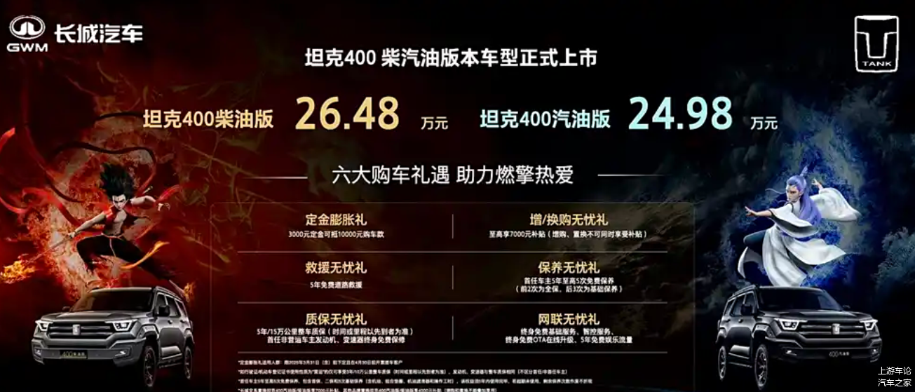 总的来说,坦克400燃油版车型在动力性能、越野能力、内饰设计等方面均表现出色,但配置精简和部分舒适性配置的缺失也可能让部分消费者感到遗憾。不过,考虑到其市场定位和价格因素, 坦克400(图片 | 参数 | 询价)燃油版依然是一款值得考虑的硬派越野车型。对于追求极致续航与低扭性能的消费者来说,柴油版无疑是一个不错的选择;而对于需要兼顾城市舒适与越野可玩性的消费者来说,汽油版则更加合适。