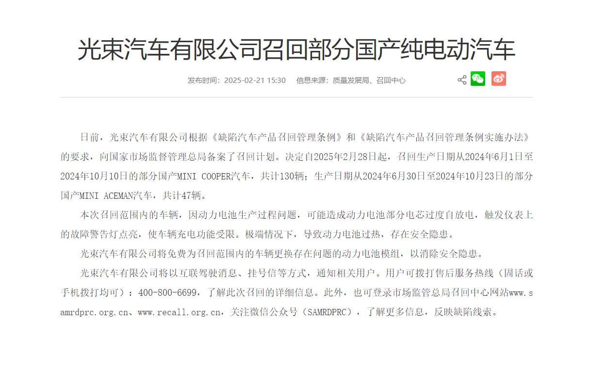 另一方面、召回生产日期在2024年6月30日至2024年10月23日的部分国产MINI ACEMAN汽车,共计47辆。