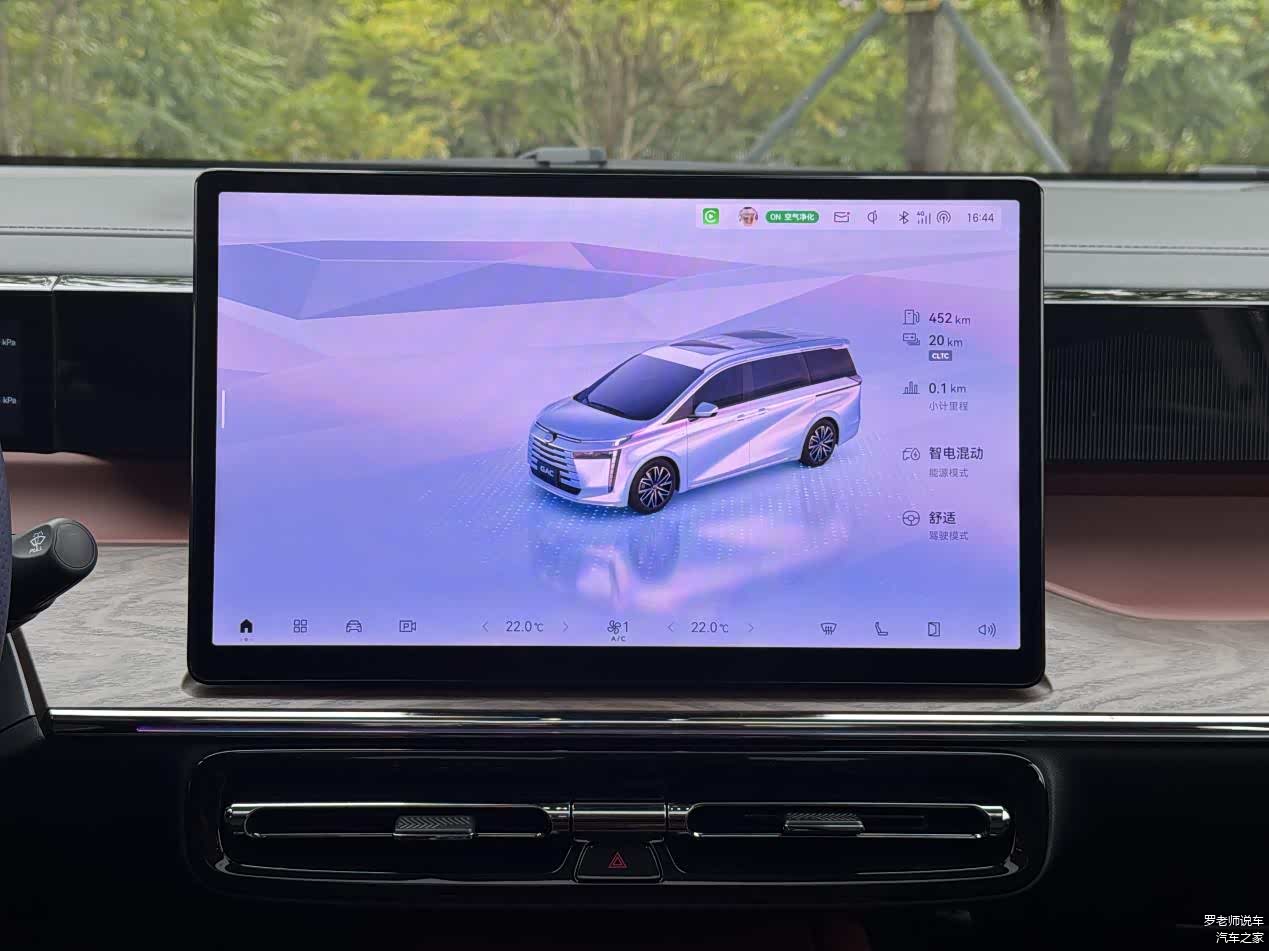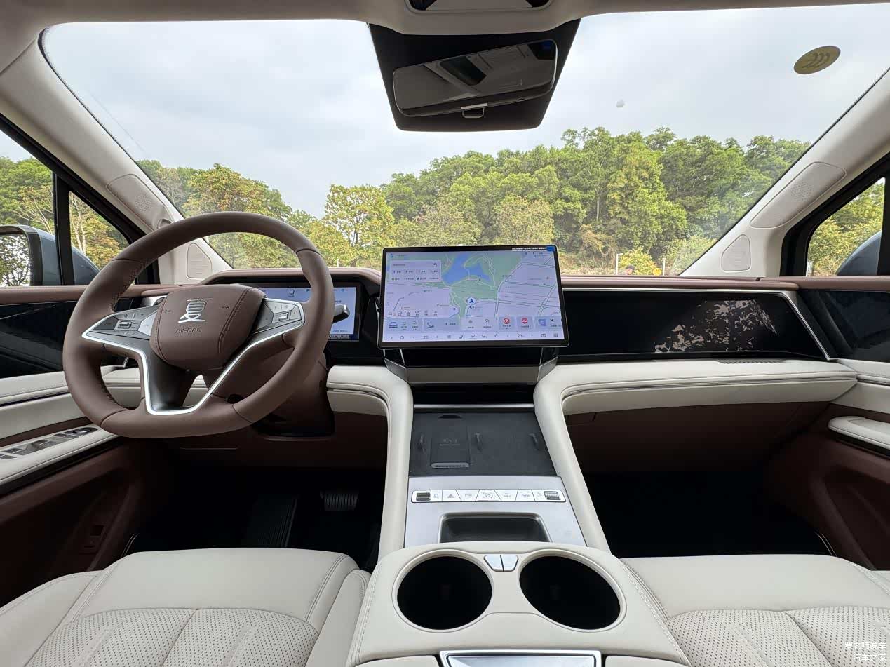 内饰方面,两车的内饰风格就有一些相似了,先来说说传祺E8+吧。坐进车内,我们可以看到整体的设计风格偏向简约,车厢内没有布局太多的按键,这一点就非常具有新能源范儿了。科技方面,它提供了8.88吋液晶仪表以+14.6吋中控屏组合,车机系统为ADiGO 5.0智能操作系统,车机芯片则选用了高通骁龙8155,在这颗芯片的加持下,车机在滑动过程中的跟手性不错,相信未来哪怕再用上个几年,也不会出现明显的卡顿现象。