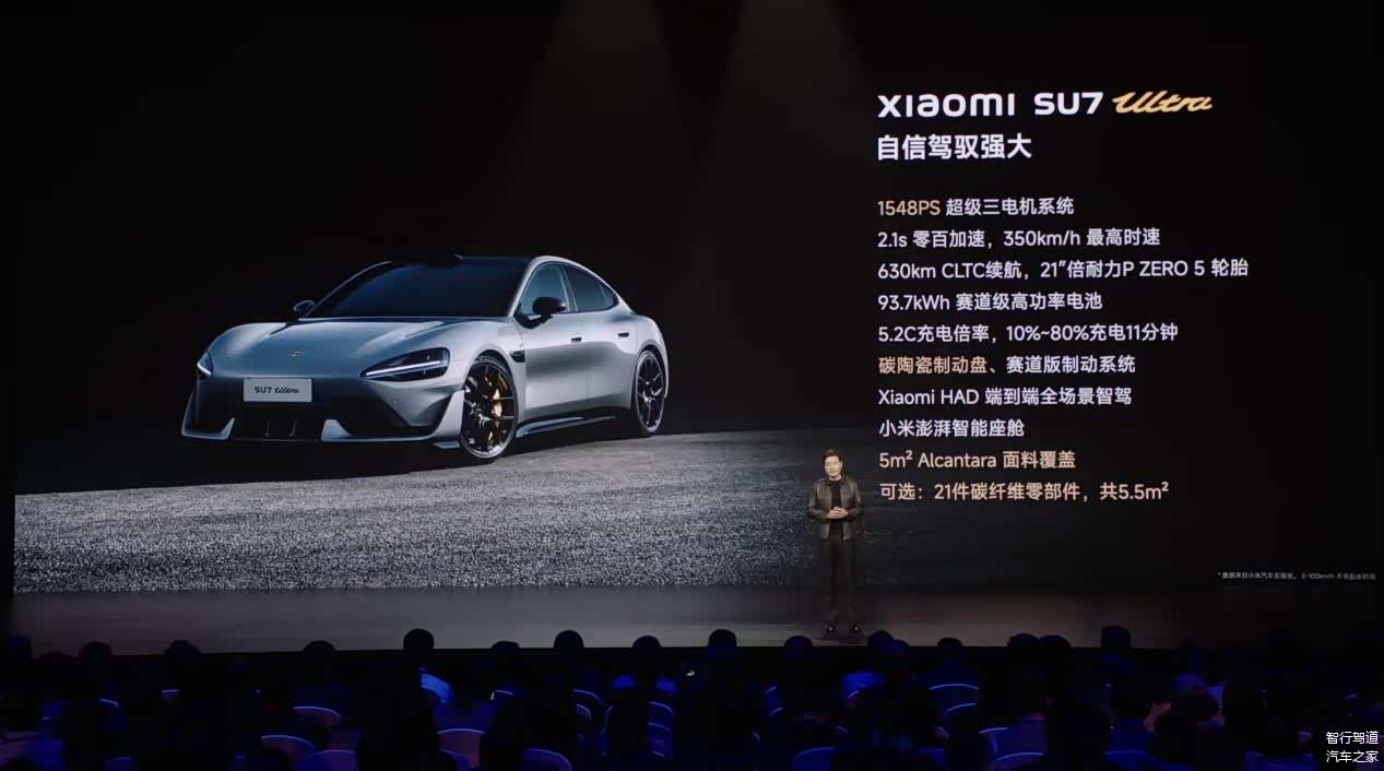 续航方面,小米SU7 Ultra采用高功率三元锂电池,电芯由宁德时代提供,电池容量为93.7kWh,CLTC纯电续航里程可达630km,以及搭载了小米自研的Xiaomi Pilot Max 辅助驾驶系统。