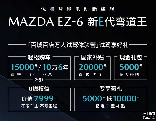 消费者对马自达EZ-6的普遍看法是价格太贵,目前新车指导价是13.98-17.98万元,大家都觉得这个价在市场上没有竞争力。为了扭转销量颓势,3月1日马自达总算是发布了全新优惠政策,现在购买马自达EZ-6可享受以下优惠:
