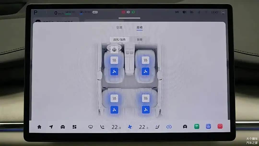 在座椅的舒适度上,启源Q07为前排和后排的四个座椅提供了通风和加热的功能,而前排座椅则提供了座椅按摩服务,而副驾驶则提供了零重力模式。