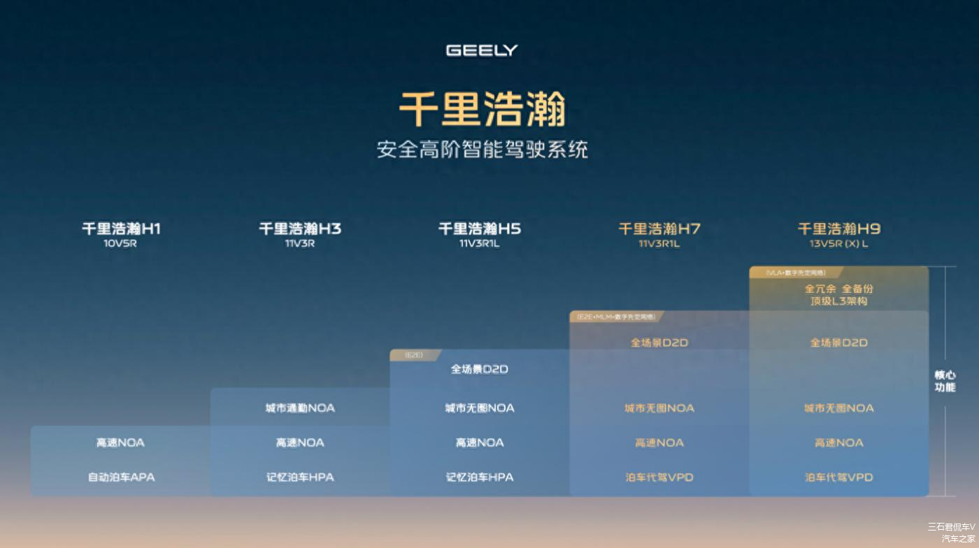 千里浩瀚不仅规划了包括H1、H3、H5、H7、H9在内的五大层级智驾方案,而且即使是最低配置的H1方案,其算力也超过了100TOPS。最顶级的H9方案,更是具备全冗余、全备份的L3架构,支持行业最大的车端算力双Thor U芯片。这意味着,无论是入门级还是旗舰车型,吉利都在力求为用户提供顶级的智能驾驶体验。