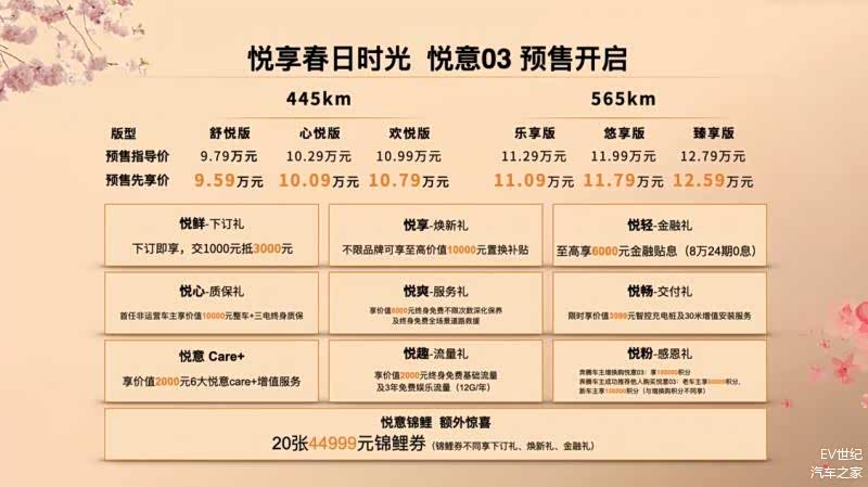 此外在预售期内还能享限时九重礼,到店试驾还有机会抽取价值44999元的锦鲤券,将悦意03的购置权益拉满。