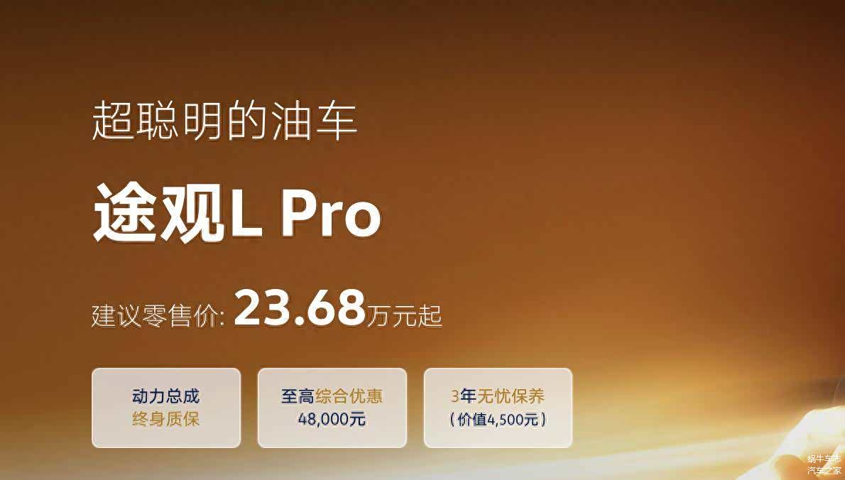 途观L Pro3月的优惠政策下,主力版本目前入手价格与新上市刚公布了一口价的途岳L非常接近。不过相比较之下,途观L Pro配置更高一些,入门的330TSI智行版即有到智能电动尾门(带记忆及虚拟踏板功能)、膝部气囊、电动折叠外后视镜(带停车自动折叠功能)、前排座椅/方向盘加热、多功能方向盘、副驾座椅 8 向电动调节、15英寸2K悬浮屏、9扬声器音响系统等。