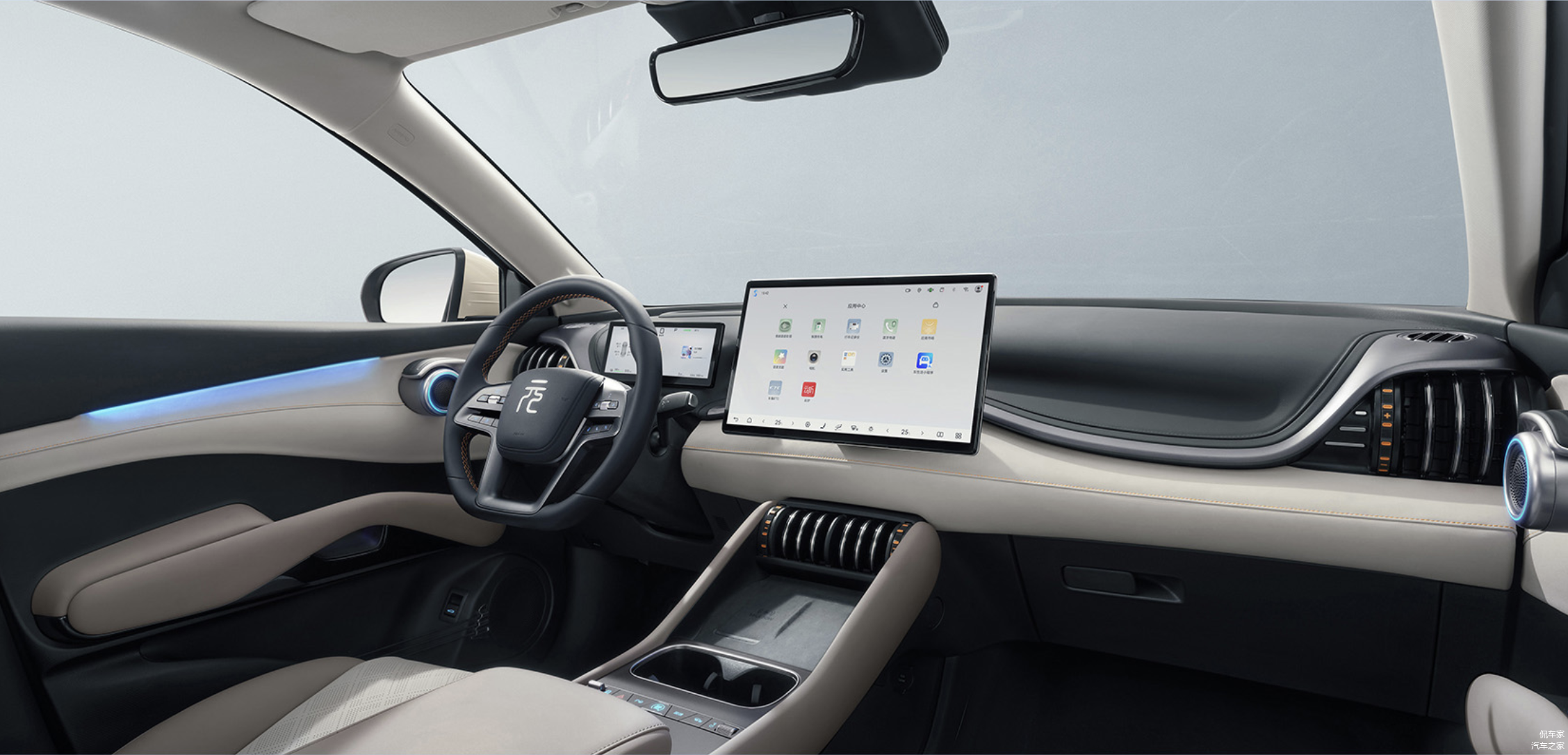 内饰以“律动空间”为灵感打造,新增怀挡设计让中控台空间更规整。全系标配8.8英寸全液晶仪表,根据车型不同提供12.8英寸和15.6英寸中控屏,搭载智能座舱高阶版 - DiLink 100系统,支持地图/壁纸双桌面、全场景语音、车载5G网络、3D控车等功能。此外,新车增加座舱软包覆盖面积,提供暮云灰和轻奢米两种配色方案。前排座椅采用全新设计,除领先版外,其他配置车型均支持前排座椅通风、加热功能,顶配两款车型后排座椅下方配有两个约7.1L的储物空间,能放置跑鞋、高跟鞋等物品。还提供全景天窗、主驾侧眼镜盒、LED柔光美妆镜等配置,顶配车型更是配备车载压缩机冰箱,支持35℃ - 50℃保温加热和-6℃ - 6℃冷冻。