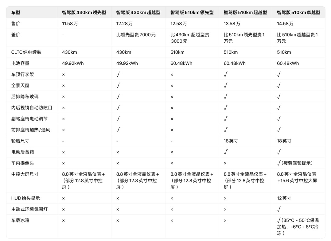 3. 智驾版510km领先型:售价12.58万,比430km超越型贵3000元。主要升级是电池容量到60.48kWh ,CLTC纯电续航达到510km,其他配置与430km领先型相同。相当于花1万元升级80km续航,如果经常有长途出行需求,对续航较为焦虑,多花3000元选这款更合适。