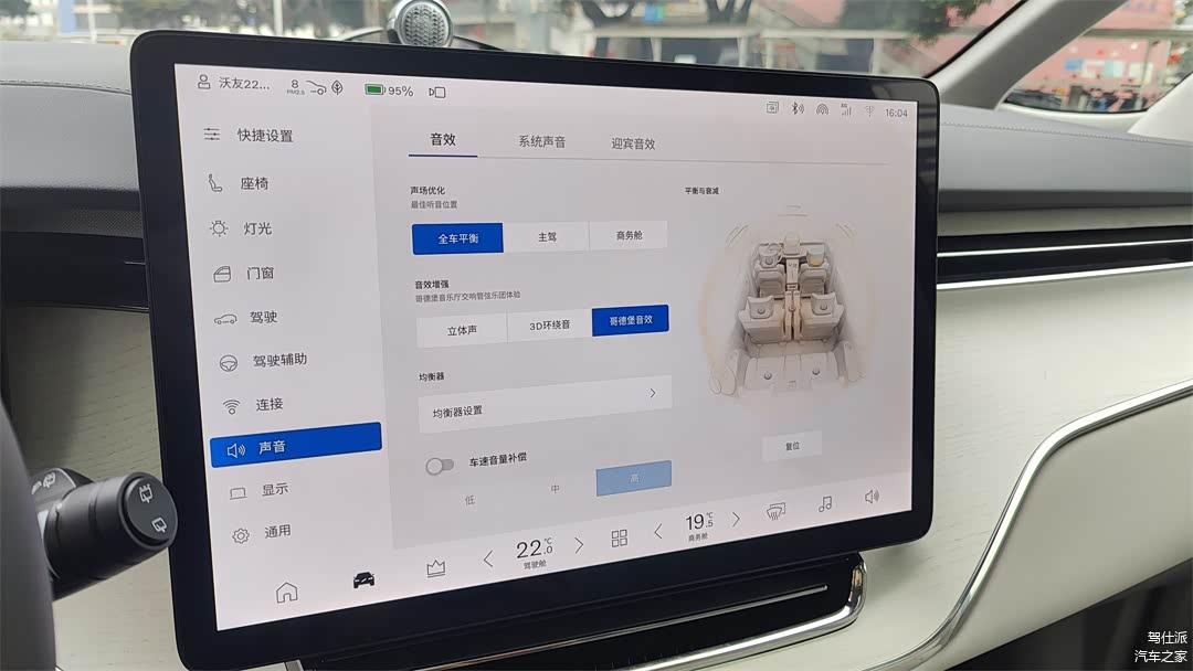 音响方面,虽然21扬声器的通道数比起009的30通道要少,但是这套宝华韦健的低音劲道十足,对于人声的解析也很自然,只是如果链接的音源不好的话可能会出现破音。功能方面有一个默认开启的“哥德堡音效”,不但带有全车环绕音效果,而且对于座舱内乘员交谈的人声,也带有放大和回音的处理效果,如此一来,车内乘员就可以压低说话的音量了,交谈显得更为轻松。