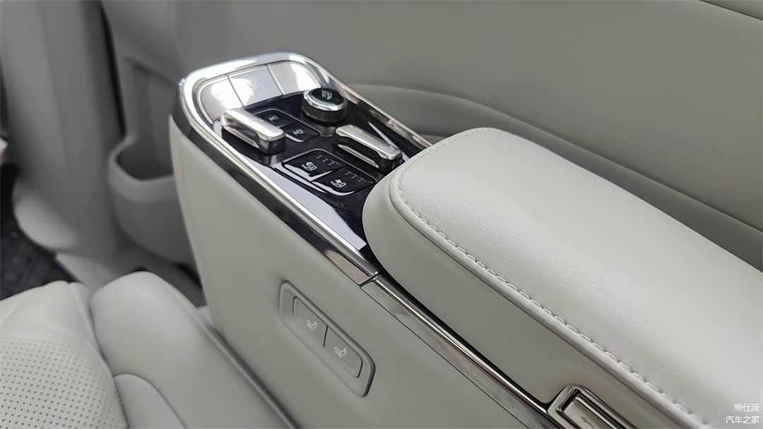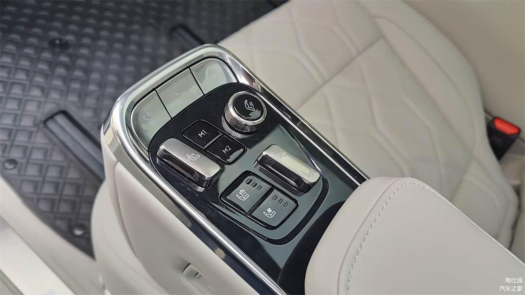 面板上的功能键全是实体按键,这点要给一个大大的赞!包括三档通风、三档加热、靠背角度调节、零重力姿态的开启和复位,甚至二排语音键都在这里,并且带有两档记忆,按摩带有五种模式和三档力度。腿托键支持角度和长度调节,不过都被整合在了一个摇杆里,刚上手的时候看上去很难直观理解,需要一点学习成本。