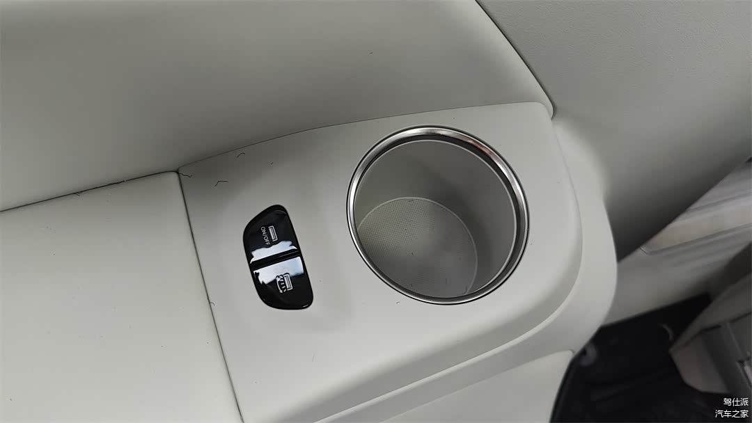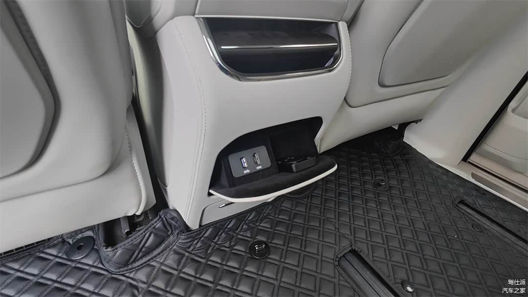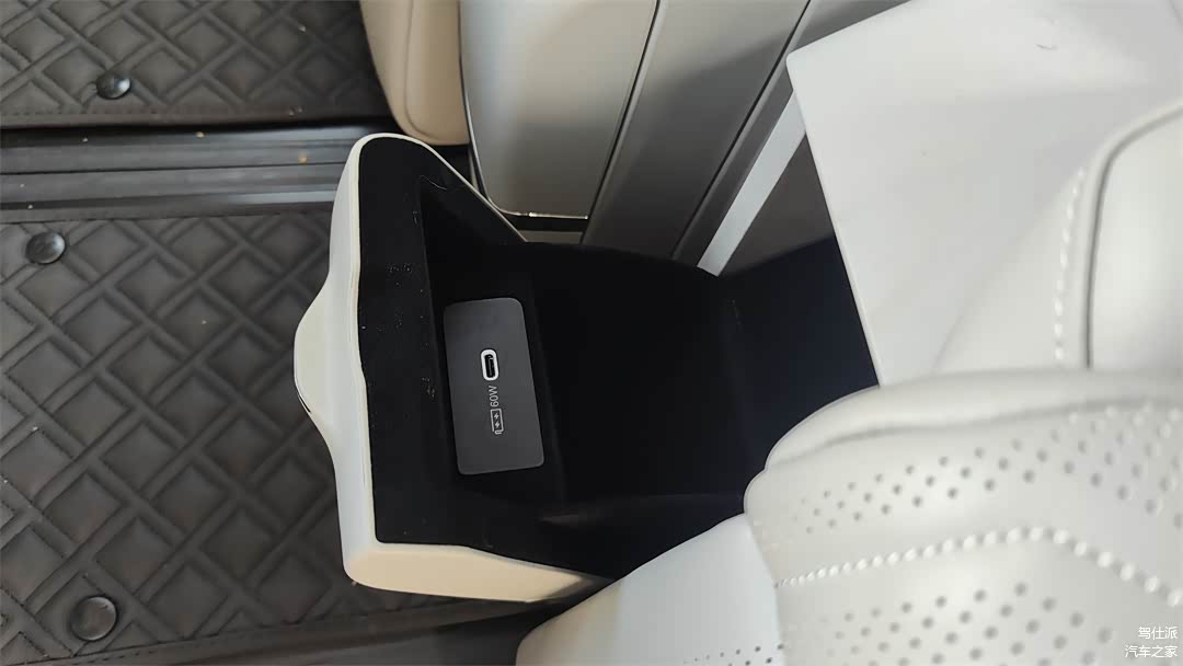 座椅搭配的USB充电接口被隐藏在了内侧扶手下方的储物格里,罩盖上留出了引线的缺口。不过左侧座椅配的是60W的,右侧却不是,算是有点小心思。