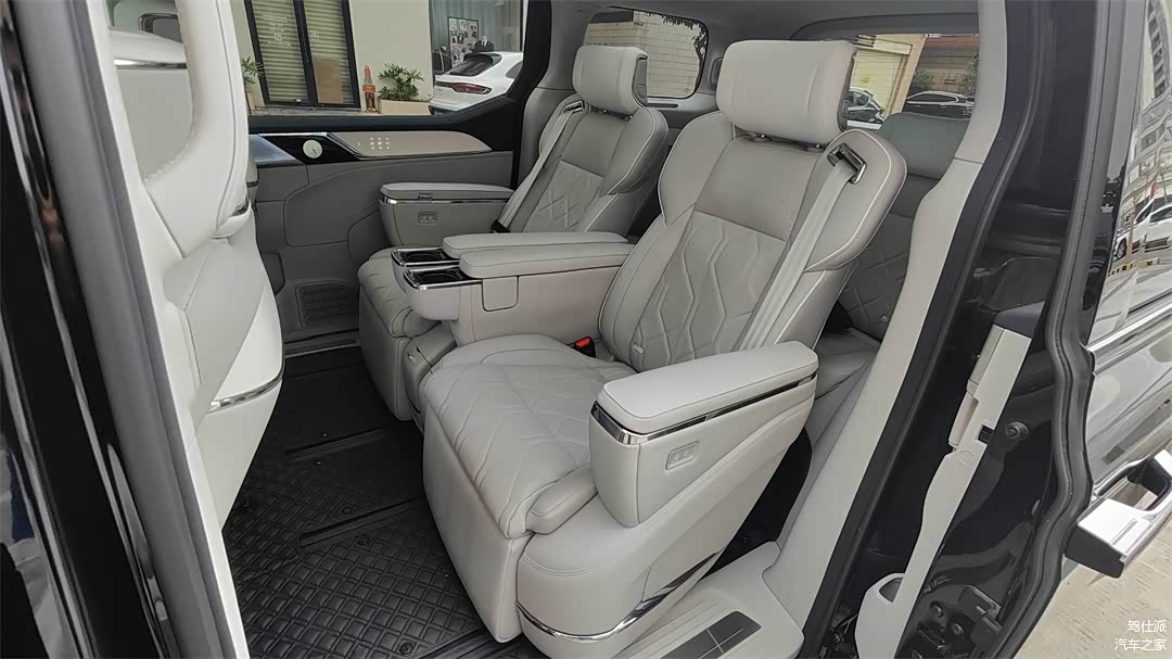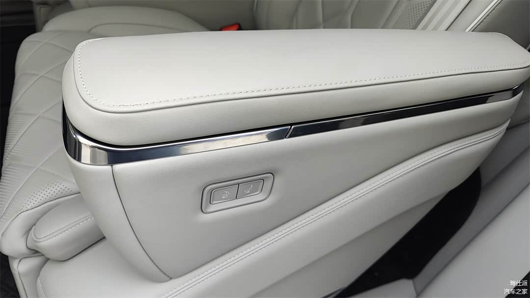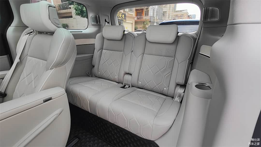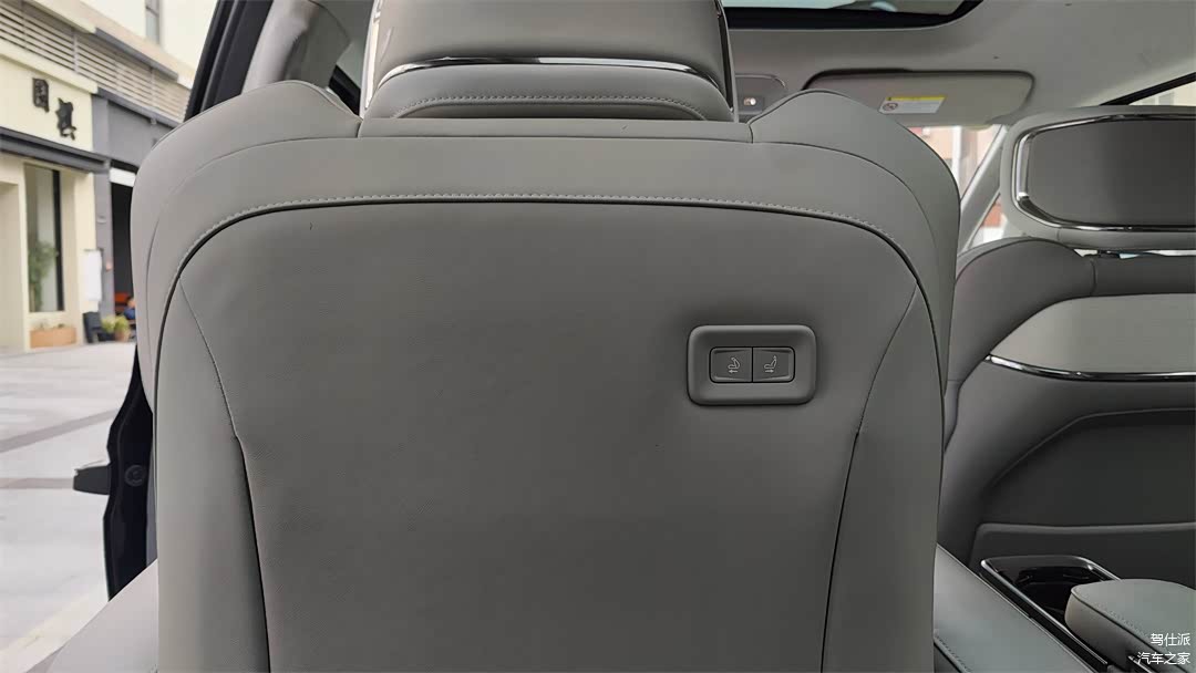 二排用了满配的航空椅,面料、填充、支撑这些方面都挑不出毛病。由于没有中央通道,进出三排必须移动二排座椅。当然座椅外侧前后移动座椅的实体键都有,并且都是一键到位。座椅前移之后留出的三排进出通道都很充裕。不过,两张航空椅中间的缝隙实在太小了,移动的时候甚至会出现一些皮革之间挤压摩擦的声音,而且滑轨运作时座椅的振动略微明显。
