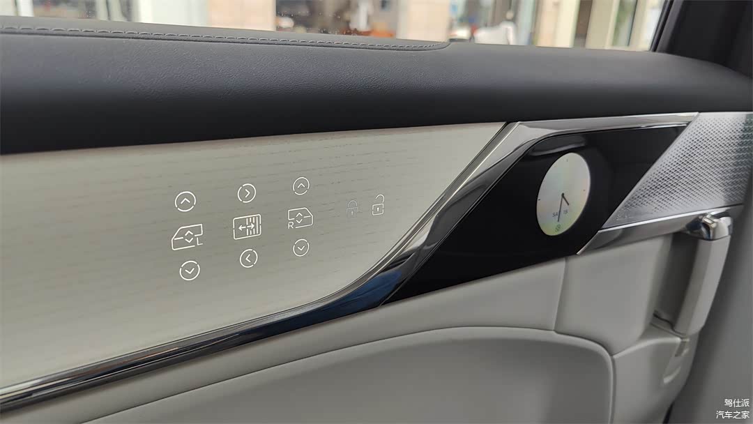 熊熊燃烧的成本也肉眼可见:侧门的内门板上居然也堆了不少功能,譬如任意一侧的触控面板都可以调整两侧的车窗升降、门锁和后排遮阳帘,并且各自带有一块独立的小触控屏,待机状态下会显示时钟,不仔细观察和去研究的话,甚至都不知道这居然是带有可翻页的隐藏功能界面的,包括后排空调的温度、风速和风向模式调节都被放置在了这里。