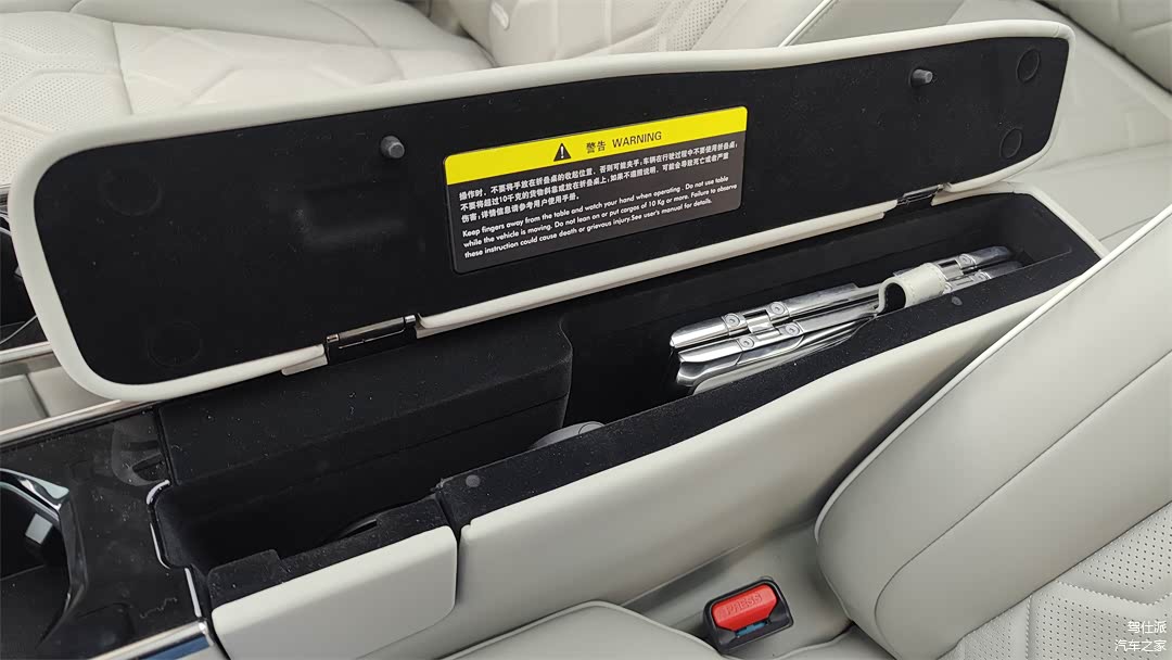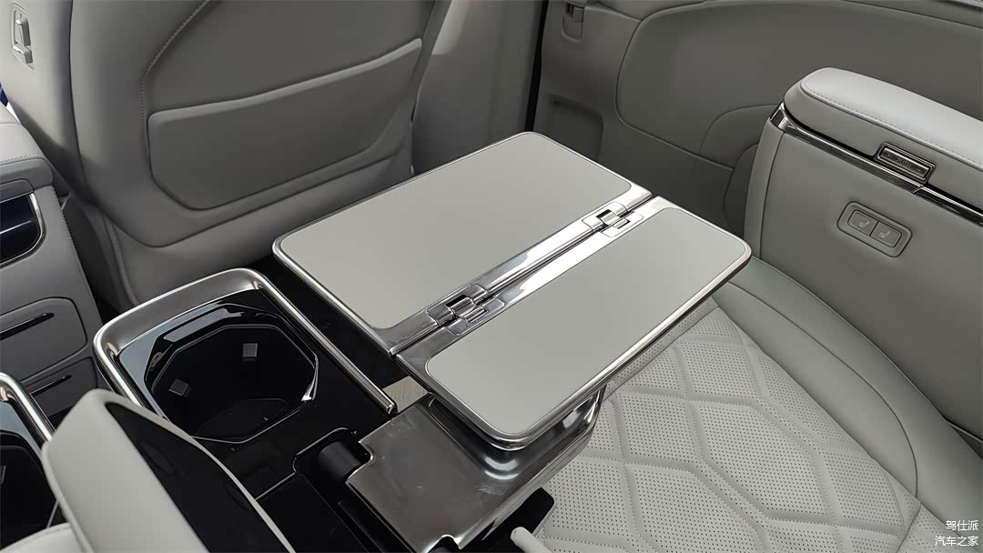 中央通道的位置,被座椅内侧隐藏的折叠小桌板所占据,左右两侧的座椅都一视同仁做了配备。这比起挂在前排靠背上的设计明显要更合理。做工极为精良,全是明晃晃的不锈钢边框,展开和折叠过程的阻尼都很紧致。桌面还分成了两部分,不但能完全打平放电脑或者杂物,还可以把前端部分折叠成特定角度,作为支架来放平板或者手机。