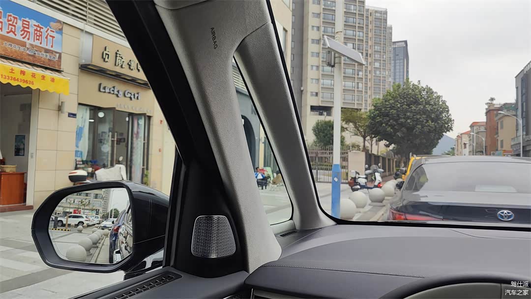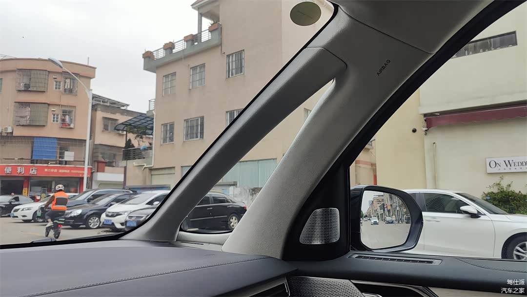 唯一的问题是中控台的纵向厚度比较大,好在车头比稍短、H点也足够高,这对于前方下视视野的遮挡问题有一定的缓解。另外A柱的三角窗面积很大,粗壮的主体位置被尽可能后移,截面也相对扁平,有效减少了侧方视野的遮挡。