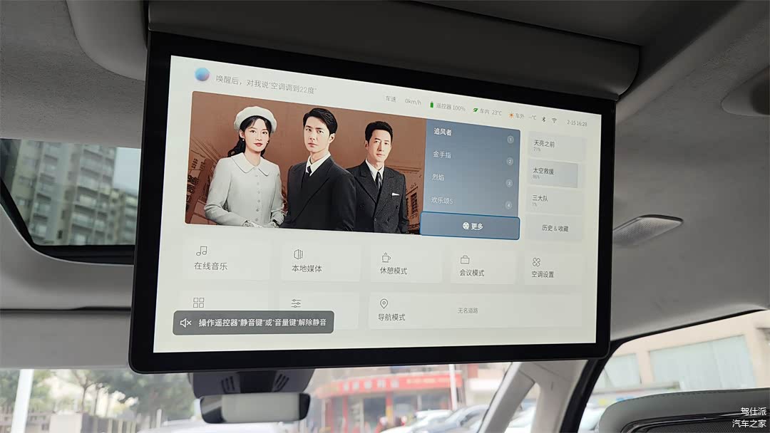 槽点有二:一是需要另外开启车内Wifi给屏幕提供网络信号;二是语音功能对于电视系统的覆盖并不是很好,不能像其它新势力厂商的吸顶屏可以直接用语音点播指定的节目。