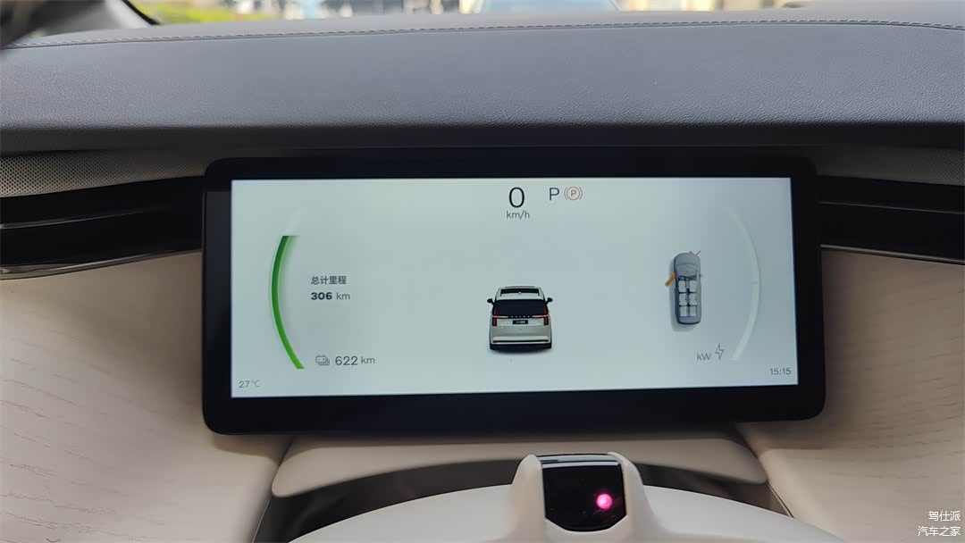 仪表的布局清晰简洁,相比注重调性的极星还要多了几分素雅,美观程度有所提升。但是字体变得更小了,所以信息的可视性有一点下降。仪表中央的智驾部分的SR渲染,帧率还是比较高的,但是障碍物的模型角度比较单一,所以跑起来的效果就像是一个高清的Flash小动画,看上去不太高级。