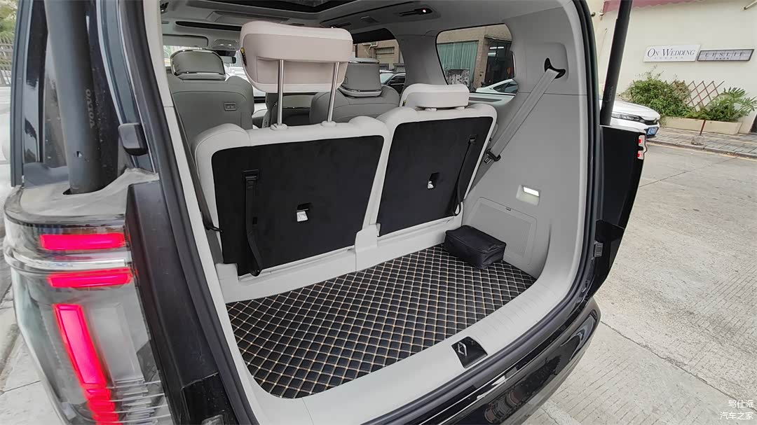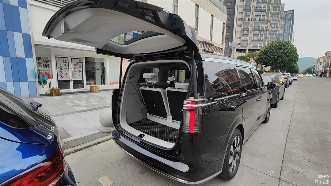空间利用方面,EM90的设计不如它的日系对手那般考究。三排只能简单放倒座椅靠背,而无法完全隐藏在地台下方。尾厢的标称容积342L,凑合够用,有趣的是在车身尺寸相近的条件下,极氪009的尾厢容积(574L)要比EM90大得多。另外尾门虽然不算特别长,但是因为没有特殊的结构设计,在5.2米车长的影响下,要取放尾厢行李的话,要注意留足车门的活动空间。