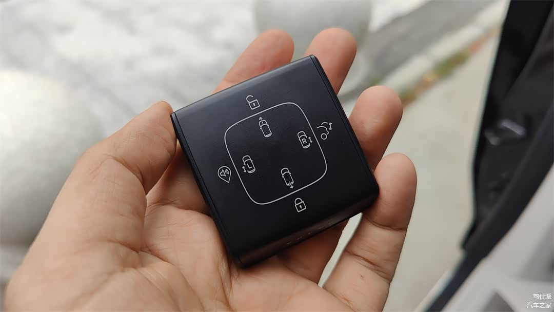 钥匙在功能上和极氪009完全一样,换了一个质感更稳重的方壳子,感觉有点像巧克力。除了常规的上锁、解锁、尾门键之外,还有专门的鸣笛寻车键、左右滑动门的开关键,以及前后移动的遥控挪车键。