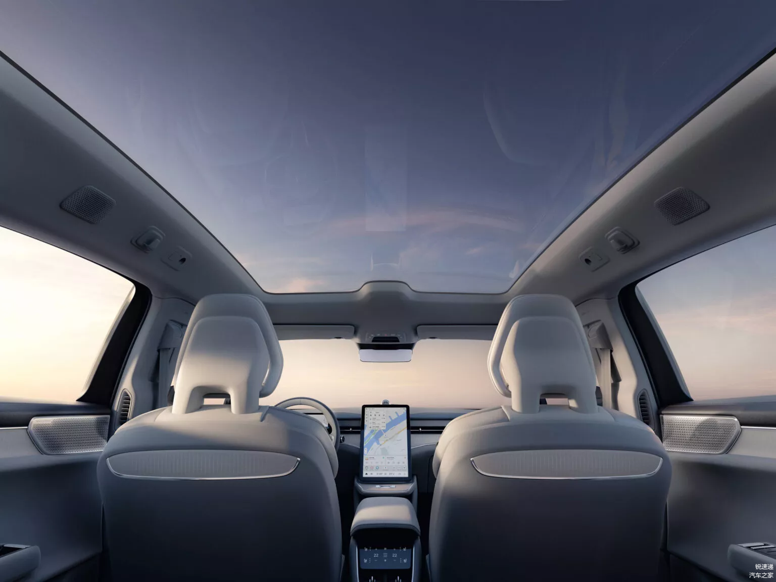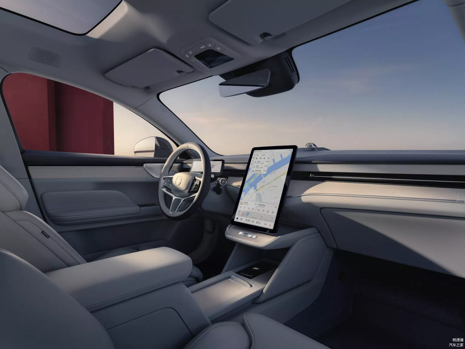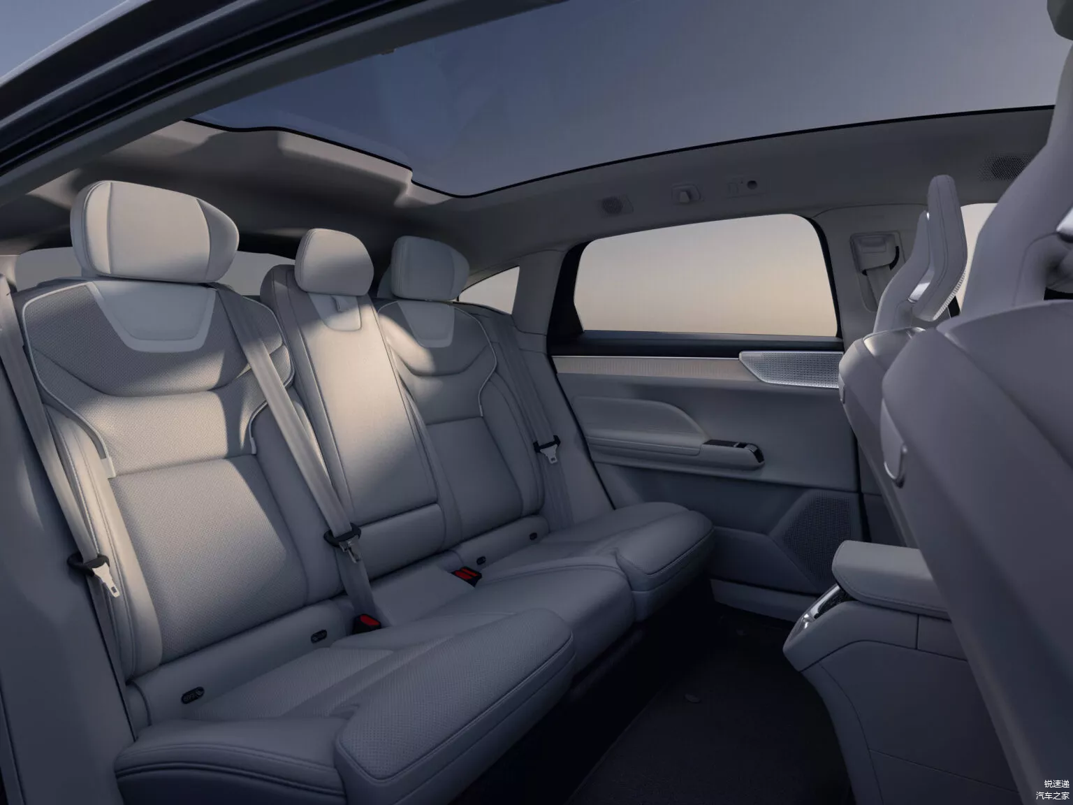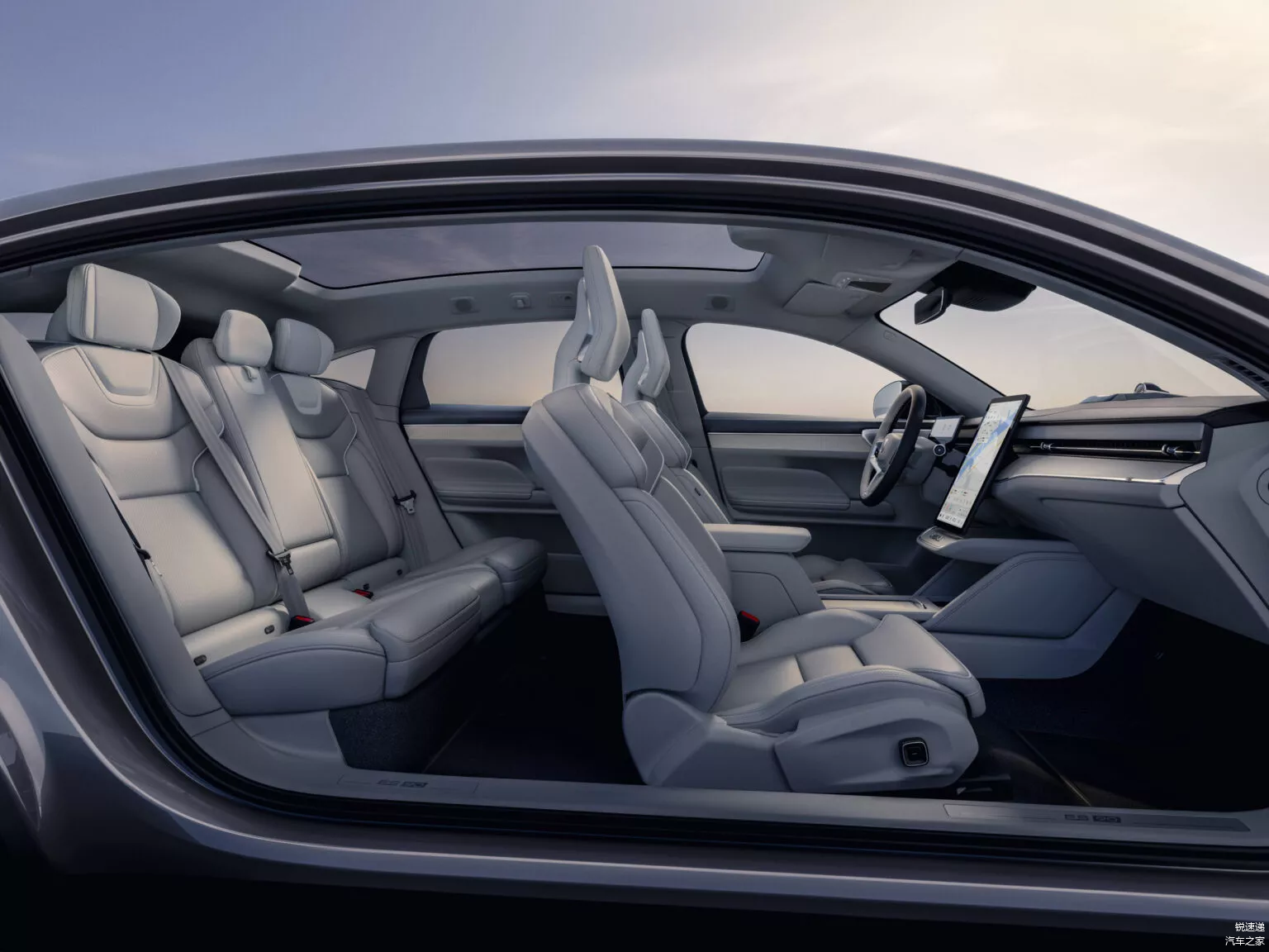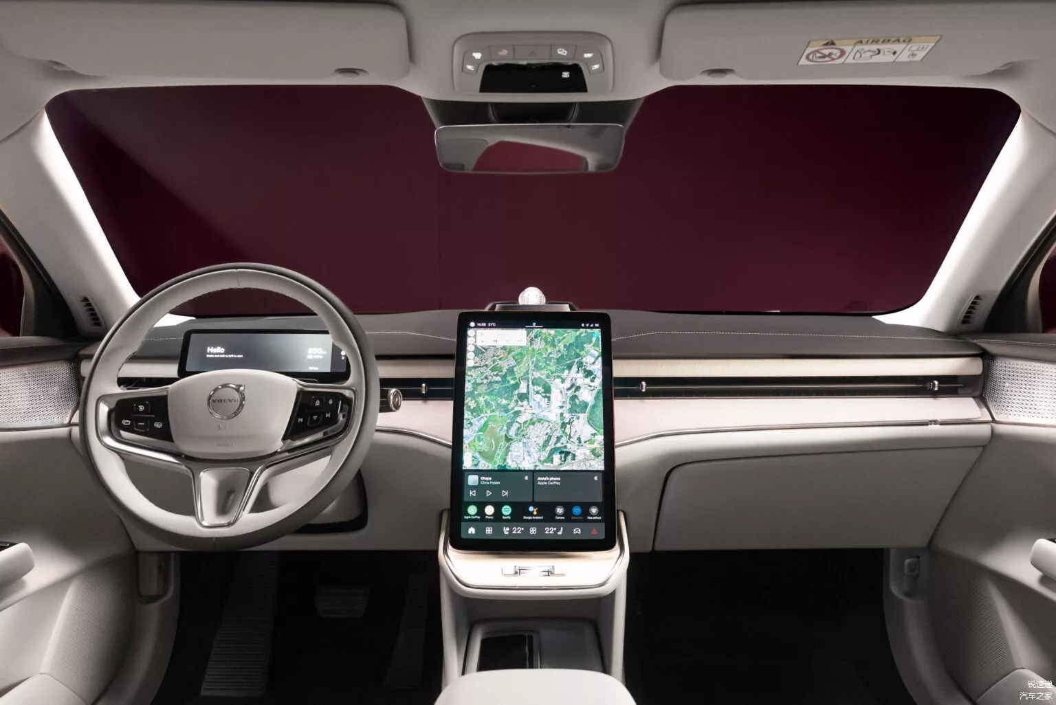 内饰方面:ES90 配备了 9.0 英寸的液晶平板仪表和14.5 英寸纵向中控屏,智能驾驶辅助系统采用算力达508 TOPS(每秒508万亿次运算)的英伟达双DRIVE AGX Orin芯片,核心计算性能较前代提升8倍,中控娱乐系统采用骁龙平台,支持5G网络,标配驾驶员感知系统(DUS),监测驾驶者注意力,并支持开门预警、乘员遗留检测等功能。内饰依然是典型的斯堪的纳维亚风格的浅色皮质+织物双拼材质,因为车型采用了抬高车身的设计,因此尽管地板下方是电池包,但内部依然有接近SUV的坐姿及头部空间,头顶配备了可调光全景天幕。