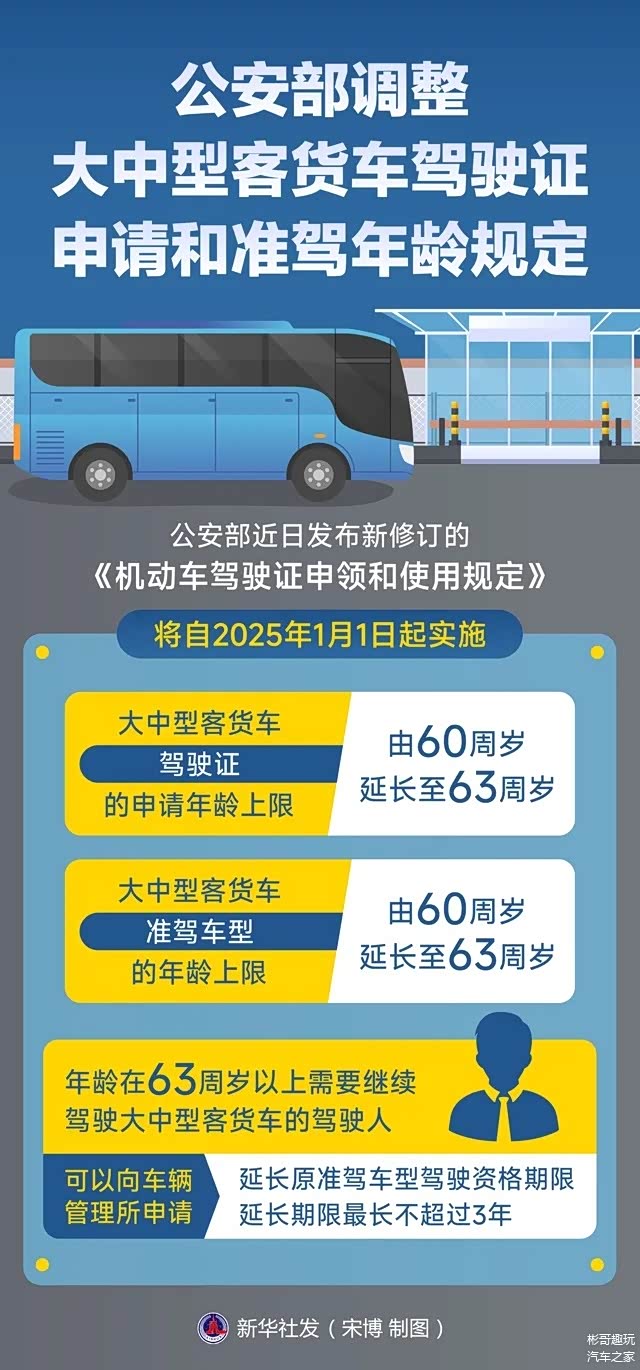 一是调整大中型客货车驾驶证的申请年龄和准驾年龄上限规定。将大中型客货车驾驶证的申请年龄上限由60周岁延长至63周岁,大中型客货车准驾车型的年龄上限由60周岁延长至63周岁。