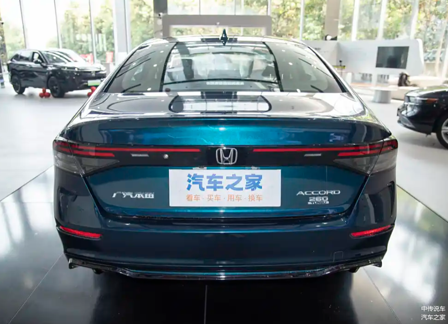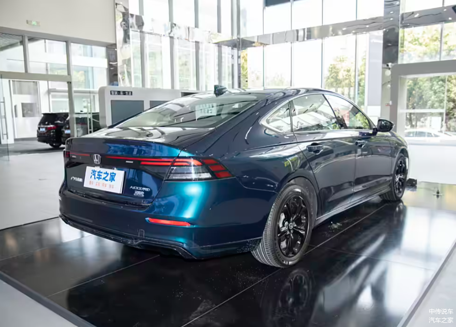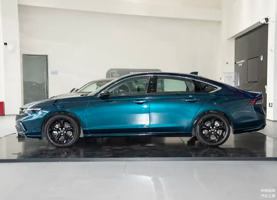 侧面造型方面,新款雅阁采用了小溜背式设计,线条干练且搭配鲨鱼鳍,进一步增强了运动感。腰线贯穿车身,从前翼子板延伸至车尾,营造出修长大气的视觉效果。轮眉和侧裙部分设计有隆起的筋线,凸显了肌肉感。轮毂采用了熏黑的双五辐式造型,风格简洁大方。
