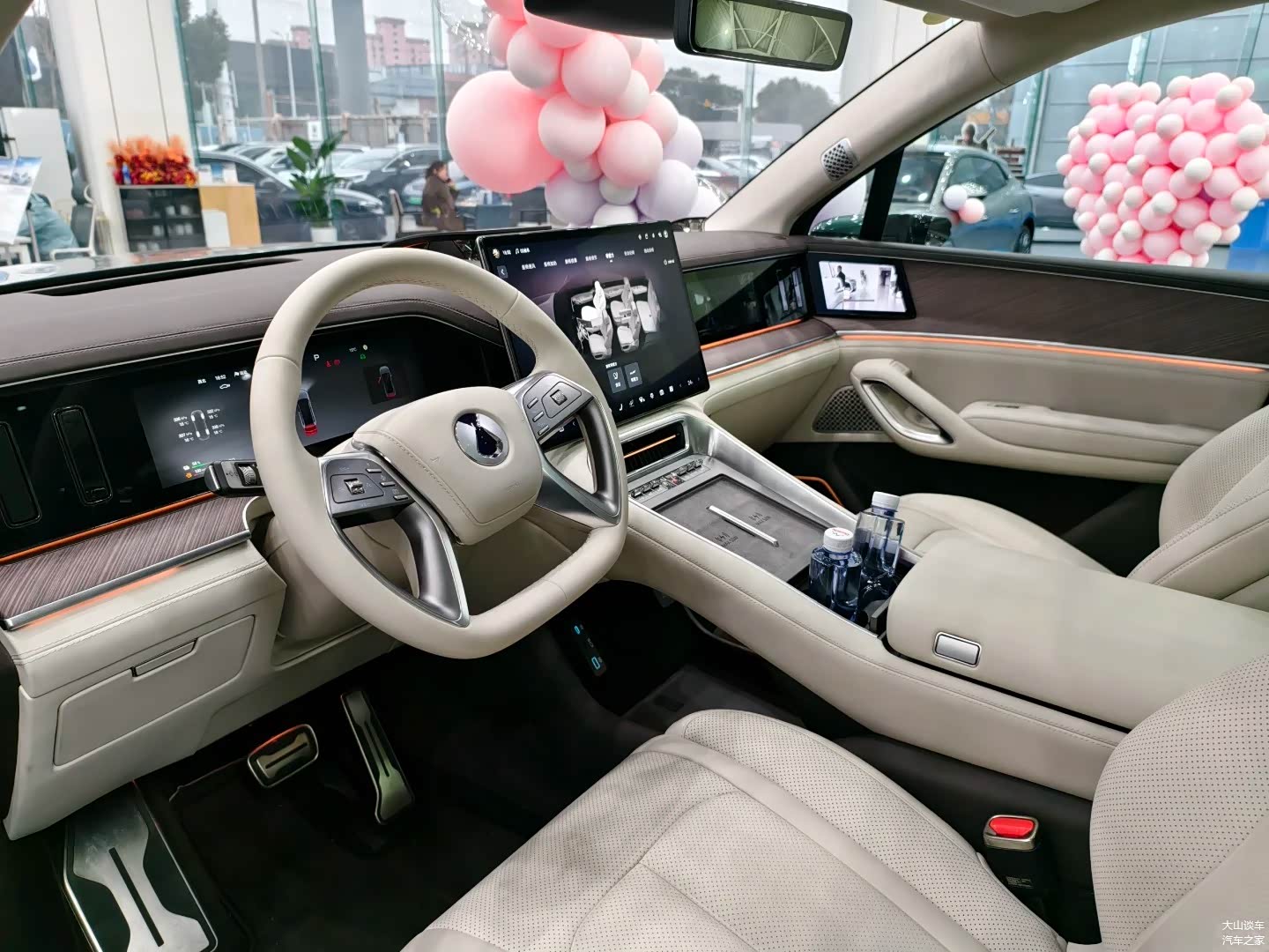 内饰方面,腾势N9提供铂檀灰、云锦米两种风格,大量真皮包覆与木纹饰板点缀,辅以氛围灯,尽显豪华档次。四辐式多功能方向盘、电子怀挡、双50W手机无线充电、水晶饰件等细节设计,进一步提升了车内的高级感。对称中控台左右各内嵌13.2英寸全液晶仪表和副驾娱乐屏,17.3英寸悬浮式中控屏与50英寸AR-HUD共同营造出浓厚的科技氛围,并搭载4nm工艺座舱芯片。