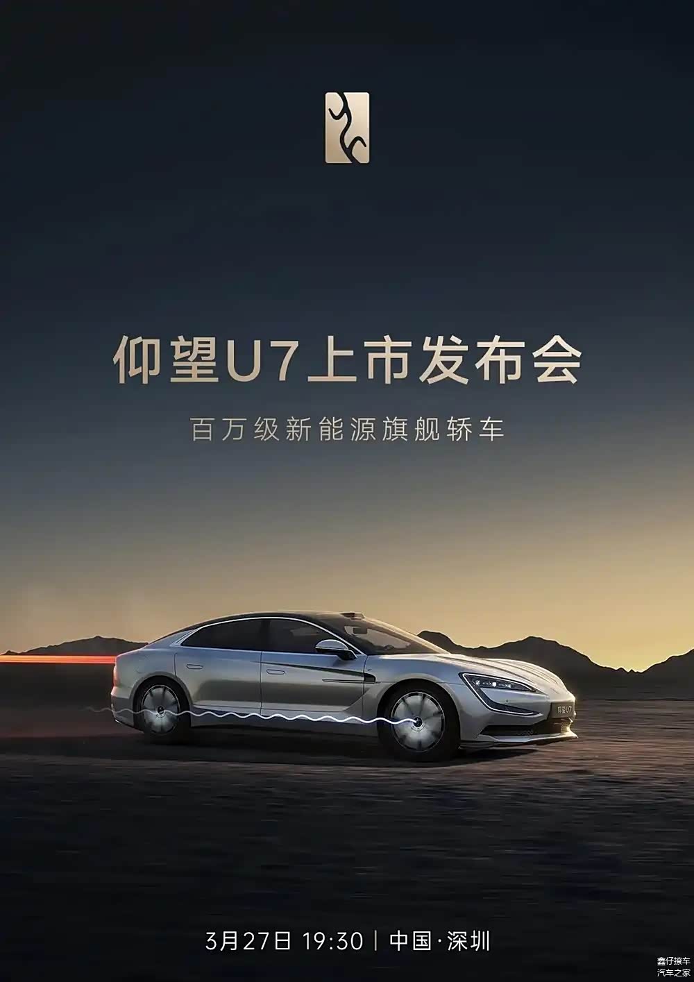 3月13日,仰望官方宣布,品牌旗下百万级新能源轿车—— 仰望U7(图片 | 参数 | 询价)将于3月27日正式上市。新车提供纯电和插电混动两种动力选择,并已开启预订,意向金为2万元,享有优先交付权益。