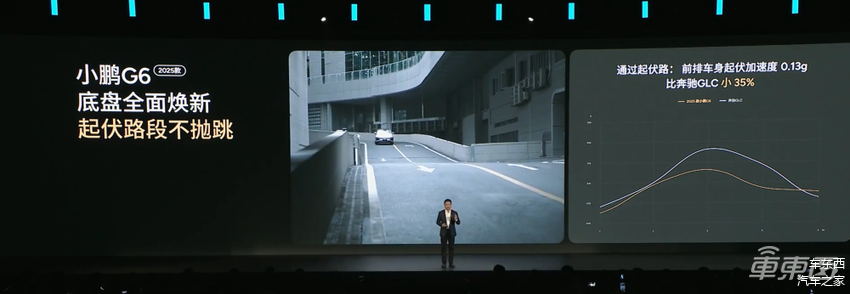 何小鹏现场直接拿出奔驰GLC进行对标,在抛跳、减速带、坑洼路等路况下整车行驶更平稳。