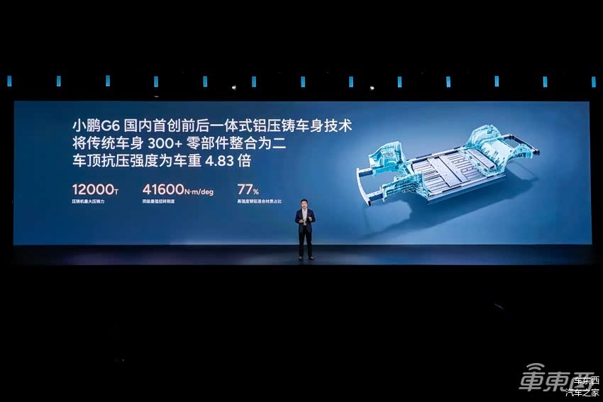 在被动安全方面,G6采用三重行业最高安全设计标准,车身由多种钢材和轻量化铝材构成,其中高强度钢材占比 26%,铝材占比 51%。前后一体铝压铸车身和CIB电池车身一体化技术增强了整体安全性。