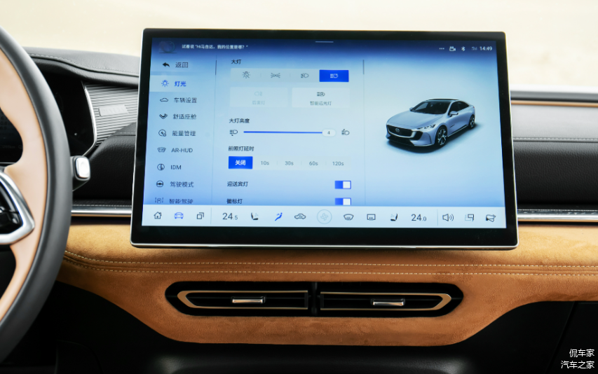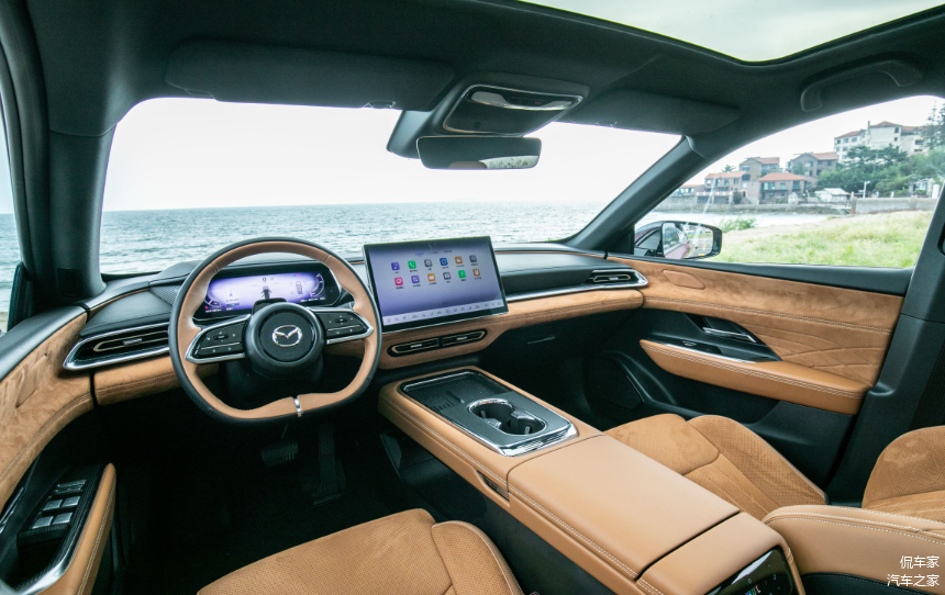 马自达EZ-6内饰方面,不管是用料还是设计,都凸显出马自达前沿的理念,触手所及是大量NAPPA真皮和麂皮材质,搭配细节处的黑色烤漆面板和镀铬饰条,档次感很强,座舱豪华感铺面而来。中间搭载一款14.6英寸悬浮式液晶屏,内置高通骁龙8155芯片,触控操作丝滑不卡顿。开车过程中,整车人机交互表现不错,支持四音区识别、可见即可说、语音连续识别、声纹识别等,可以解放双手。此外,基于1300亿参数的AI基座大模型,能够涵盖广泛的知识领域,能够为用户提供全面和准确的信息。