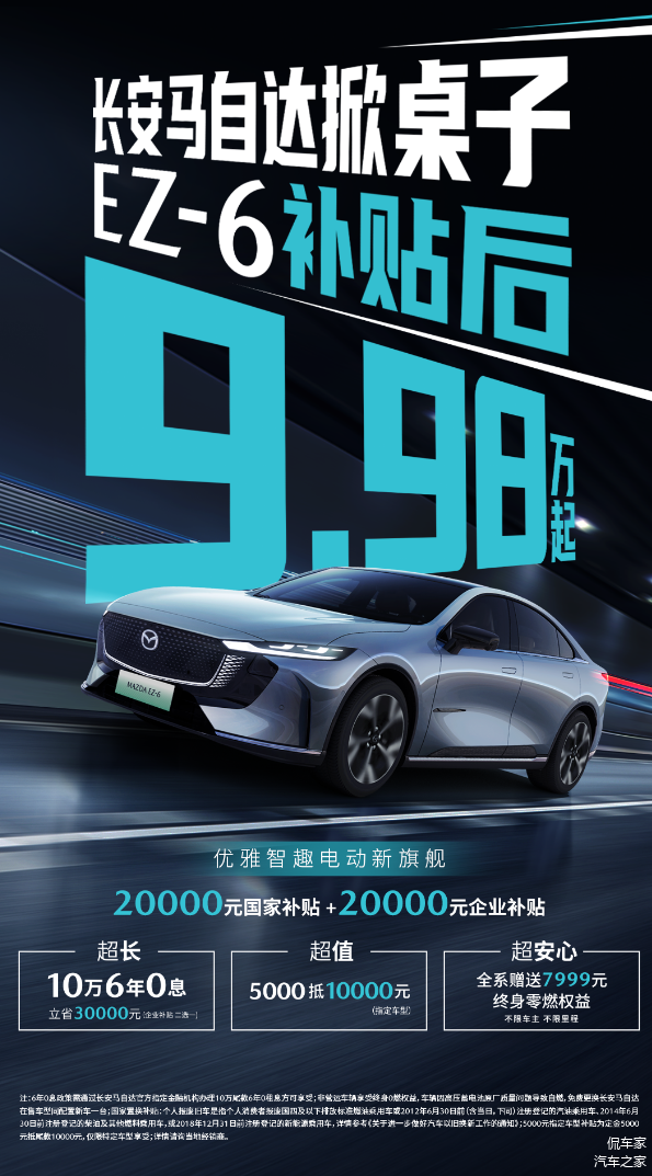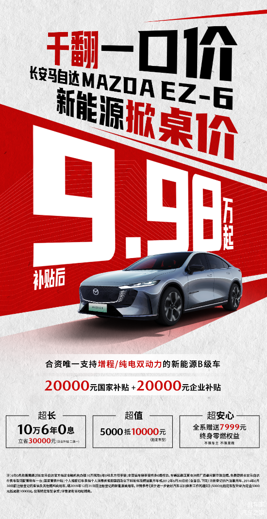 各大汽车品牌中,马自达算是一个有很强运动基因的品牌,马自达6、阿特兹都是很成功的车型。如今在新能源赛道上,马自达EZ-6也是一款产品力出色的车型。面对市场竞争,马自达也开始“掀桌子”,马自达EZ-6全系补贴后仅9.98万起,其中就包含2000元厂补贴、6年0息、7999元终身零燃权益等,意味着B级轿车正式进入9万元购车新时代。