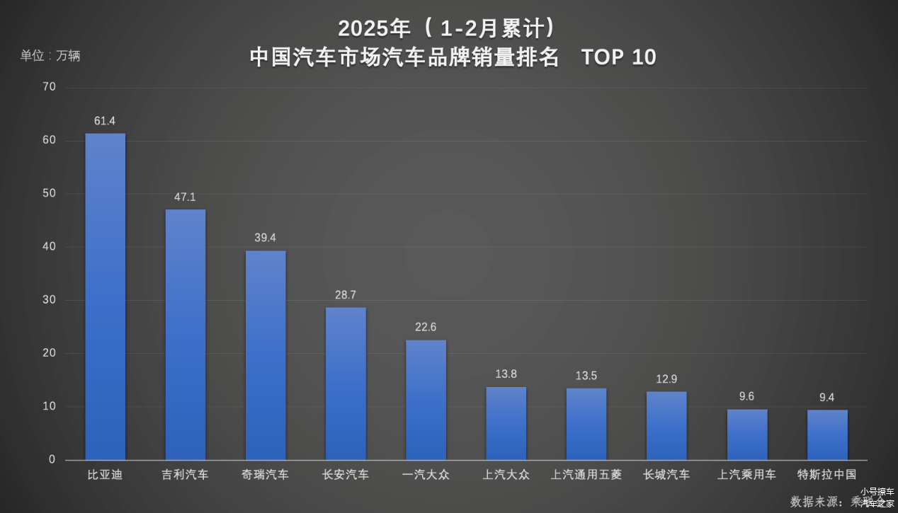 如果用品牌来划分的话,1-2月份,比亚迪品牌累计销量61.4万辆,同样是一个优势非常大的数字,排名第二的吉利汽车累计销量47.1万辆,比亚迪领先了足足14.3万辆。进入榜单前十的很多品牌,前两个月的累计销量还没有比亚迪领先部分多,不得不说比亚迪品牌的车型如今真的是太受欢迎了。
