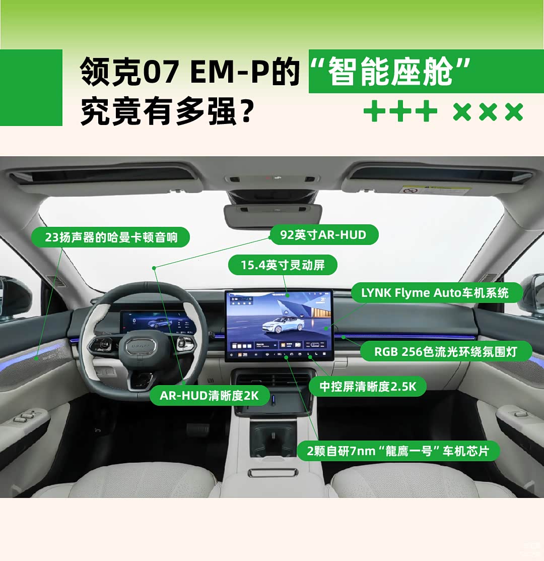 首先来看看 领克07(图片 | 参数 | 询价) EM-P,在外观设计上,该车采用原创的全新都市对立美学设计语言,灵感源自领克“The Next Day”概念车,造型独特,辨识度极高,走在街头回头率满满。进入车内,豪华感扑面而来。前后四座均采用整张NAPPA抗菌真皮包裹,座椅具备通风、按摩和加热功能,为乘客带来极致舒适的体验。搭配总功率达1600W的哈曼卡顿23扬声器音响系统,支持7.1.4多声道+3D环绕立体声,再加上专业声学团队的调校,让车内仿佛置身于顶级音乐厅。此外,12.3英寸全液晶仪表盘、15.4英寸中控屏幕、92英寸巨幕AR-HUD抬头显示等高科技配置,与Flyme Auto智能座舱、Co Pad相互配合,打造出极具科技感的驾驶环境。