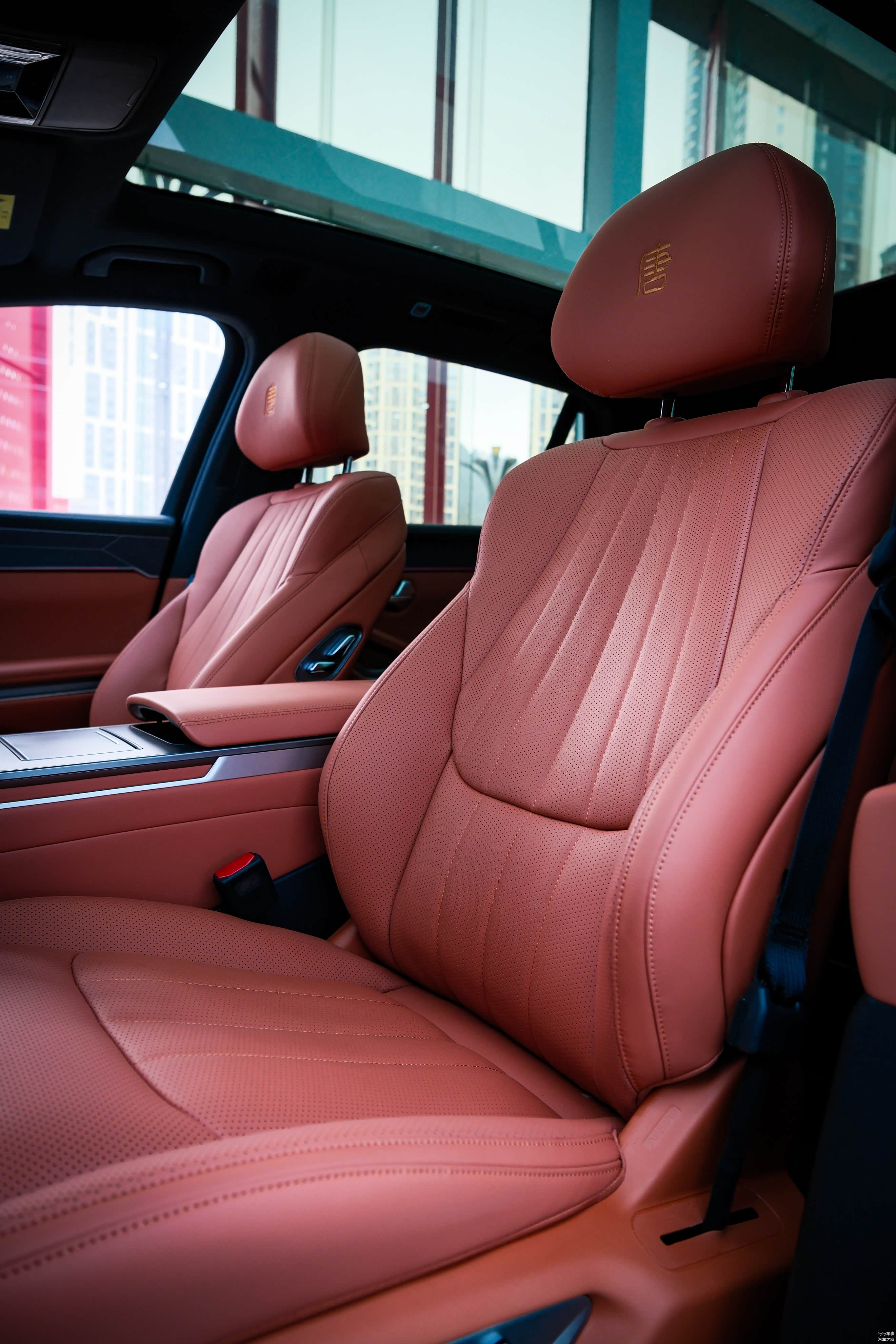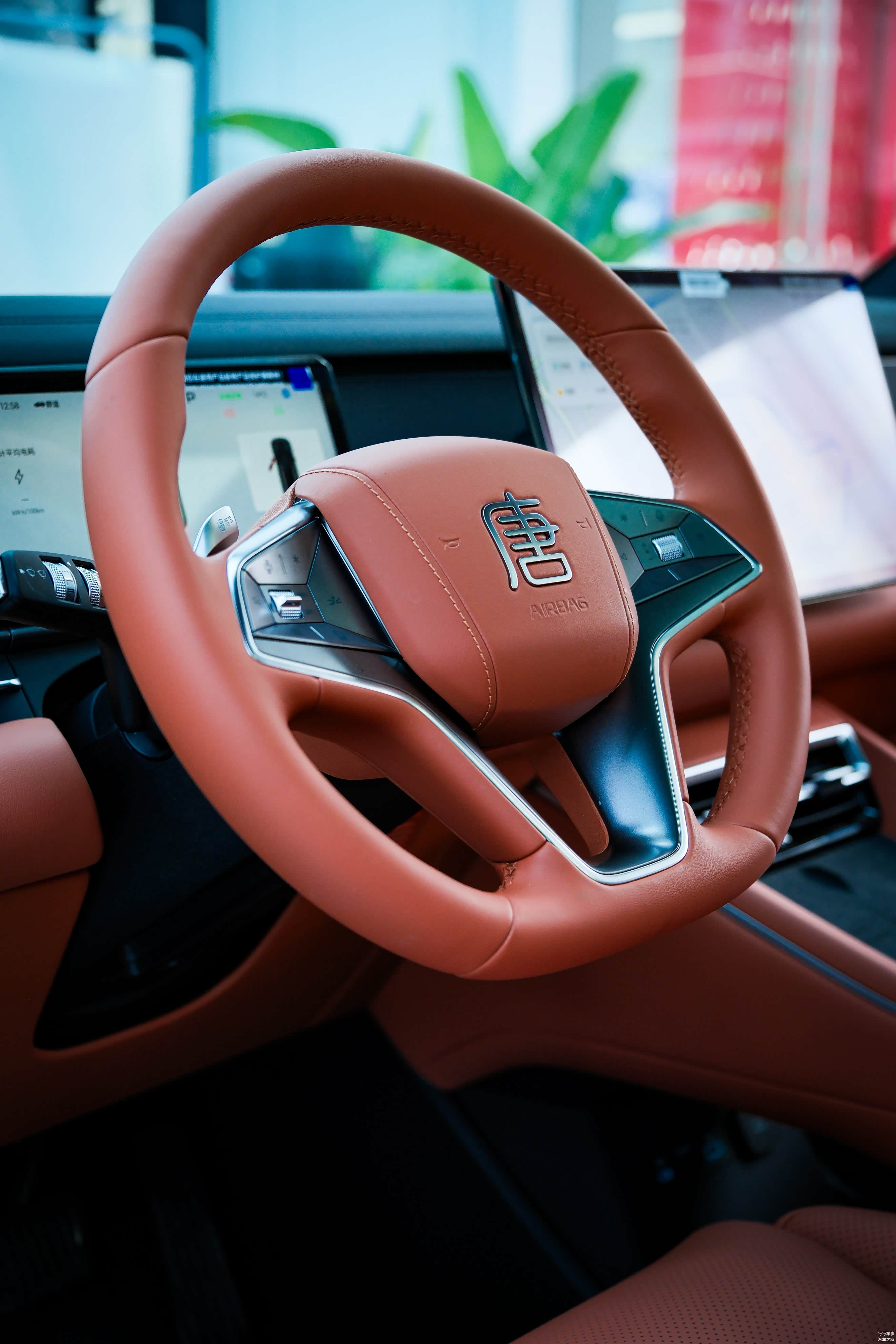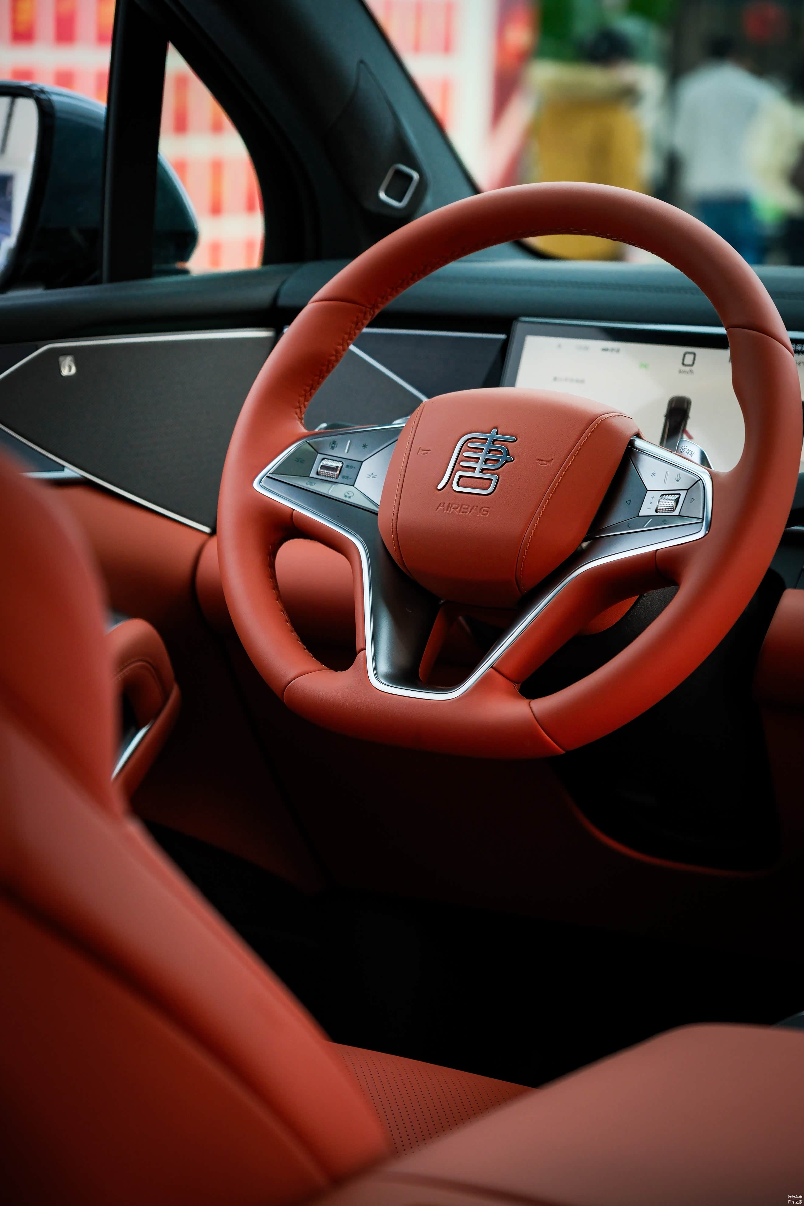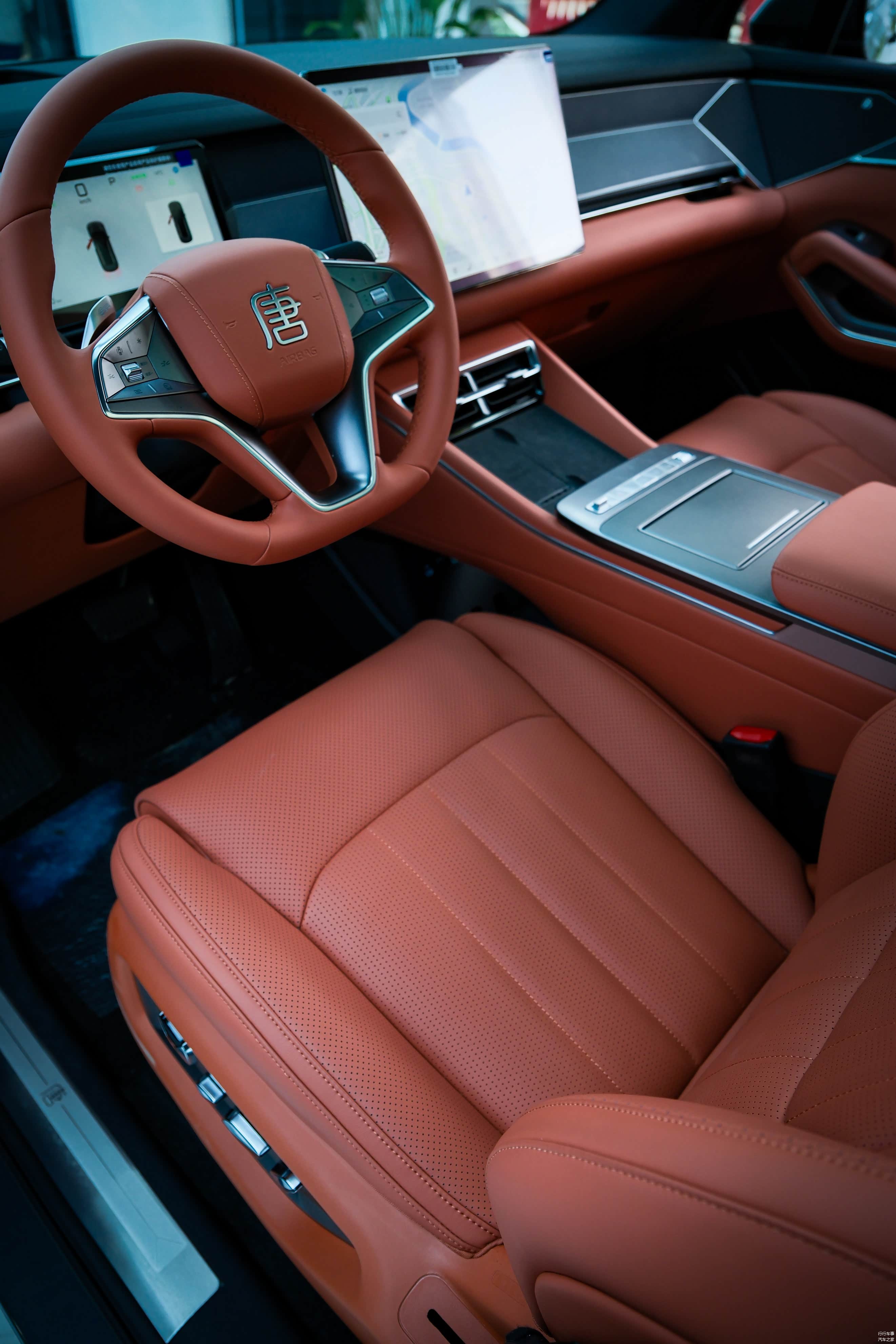 二、科技赋能人文:重新定义智能座舱的温暖边界拉开车门的瞬间,凝练东方哲学的内饰布局颠覆了人们对新能源车的冰冷想象。环抱式"山水座舱"内,饰板上的天然纹理与Nappa真皮形成材质交响,中控台"层峦叠嶂"的线条灵感好似来自贵州喀斯特地貌。最具巧思的是可旋转15.6英寸4K屏:导航时自动切换竖屏呈现完整道路脉络,观影时横屏展开IMAX级视界,这种"场景自适应"交互,让科技有了温度。
