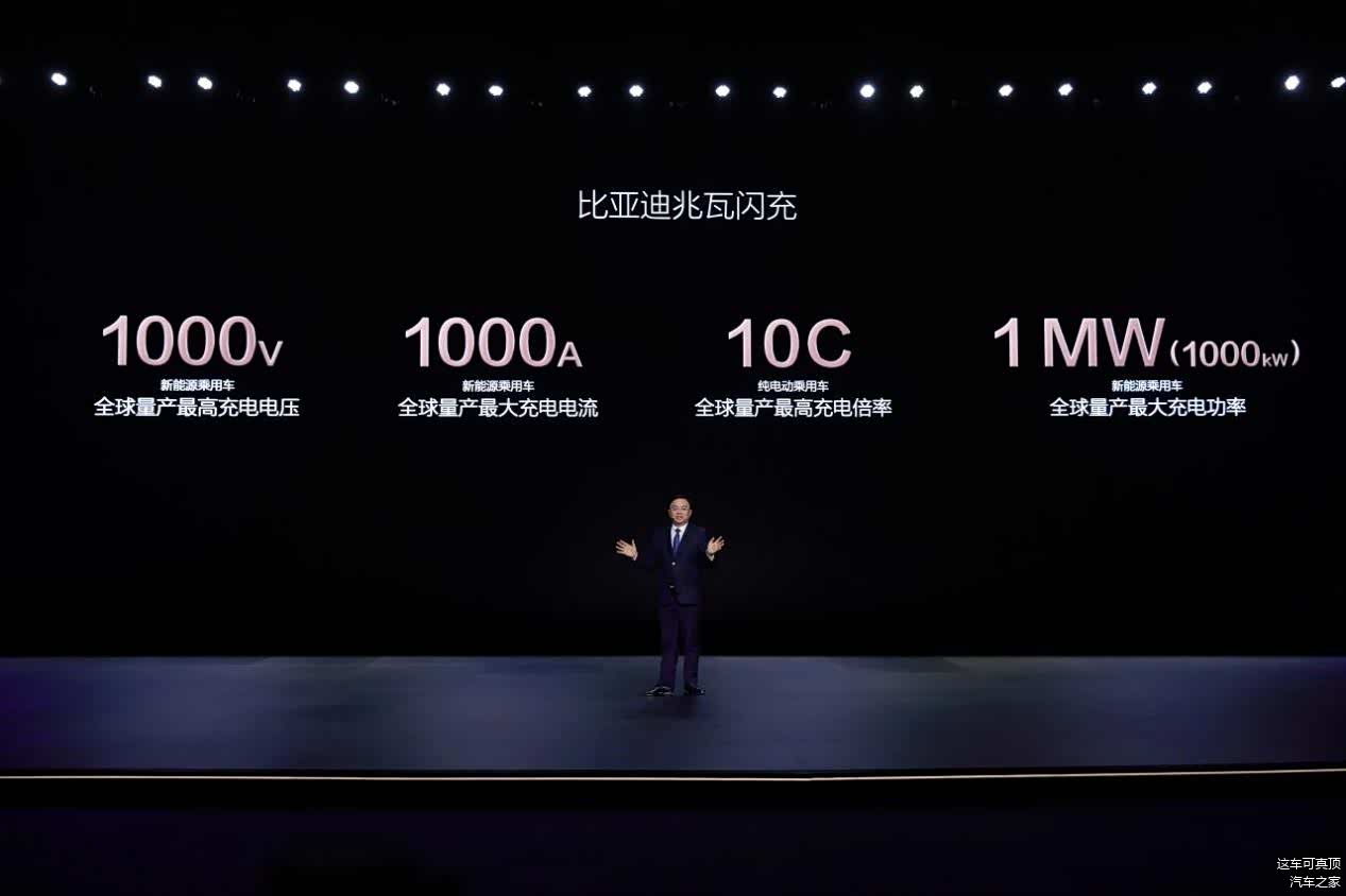 第二个是平台升级。这是今晚发布会的重中之重,比亚迪推出了超级 e 平台,汉 L 和唐 L便是新平台的首批车型。搭配上兆瓦闪充充电桩, 新车可以实现1000V伏超高压,1000A大电流,1000KW 的充电功率。这么说,你可能还是不明白。