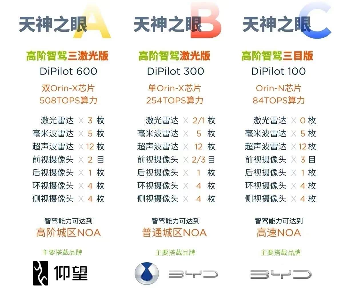 最后一项升级就是智驾系统了。汉、唐搭载的是比亚迪天神之眼C 智驾系统,用的是纯视觉智驾方案。而汉 L和唐 L采用的是更高级别的天神之眼 B 智驾系统,配备了激光雷达,智驾芯片的算力也更高,除了高速智能领航辅助外,还支持城区 NOA。