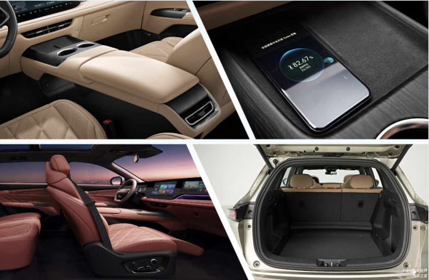 同级独有725L下沉式后备箱:常规状态下后备箱容积为610L,下沉后扩展至725L(纵向空间提升15%),二排座椅放倒后可进一步扩容至1620L。无论是全家出游的行李箱、露营装备,还是小商品运输的大件货物,它都能轻松“吞下”。更巧妙的是,后备箱隔板可拆卸,二排座椅支持4/6分纯平放倒,秒变“双人露营床”或“搬家神器”,真正实现一车多用。此外,从副驾女王挂钩(挂奶茶、外卖盒)、中控镂空鞋包柜,到50W手机无线快充(仿麂皮防滑设计),再到车顶行李架(承载自行车、帐篷等户外装备),每一处设计都在告诉用户:“你的生活,我全包了。”
