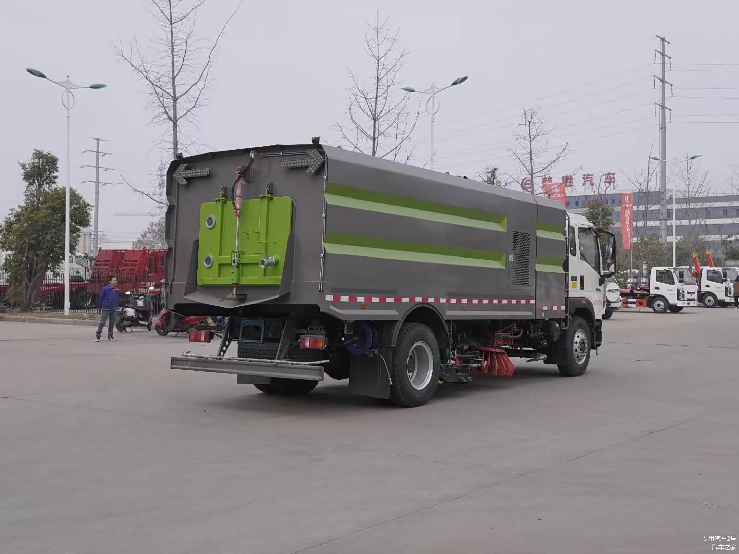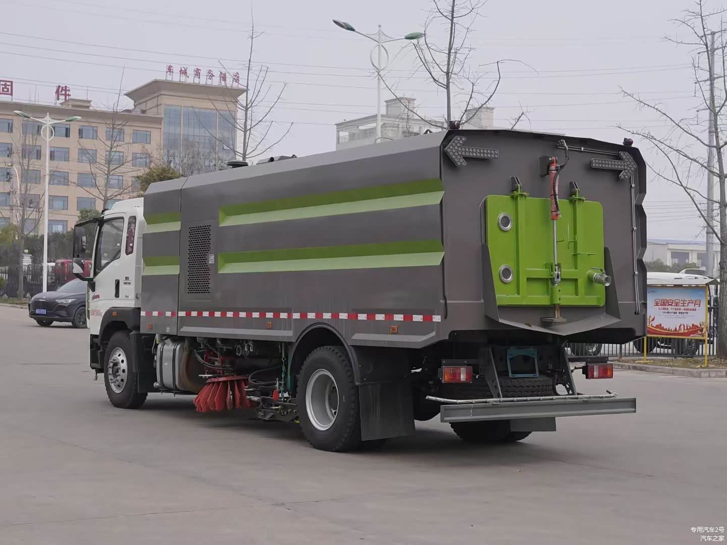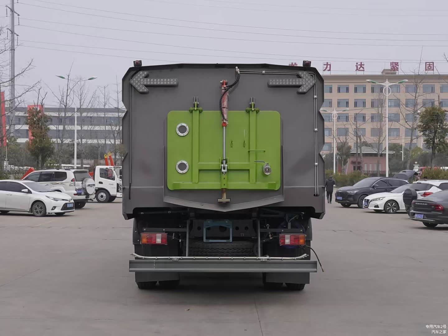 电控系统:采用 PLC 一键控制,操作简便,同时尾部 LED 箭头灯、垃圾箱和水箱带防溢低水位报警装置、倒车及洗扫状态室内监视系统等,提升作业安全性和便利性。