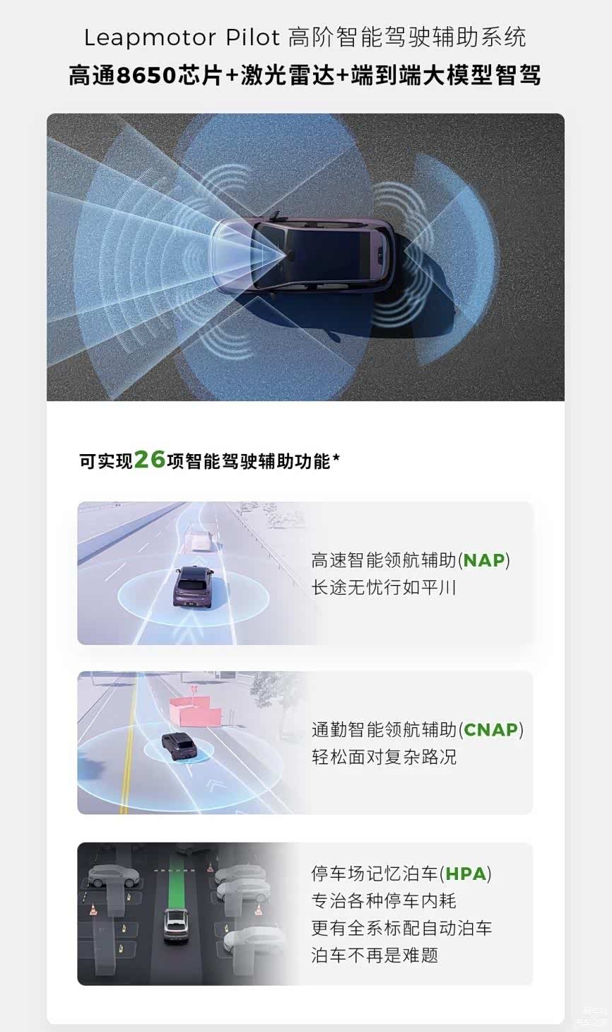 智驾方面,零跑B10的激光雷达智驾版将搭载激光雷达、高通8650芯片和骁龙智驾平台的智驾方案,支持高速/城市的领航辅助功能,未来还可以通过OTA进行升级。至于其他车型,虽然没有搭载高阶智驾系统,但也提供了很多驾驶辅助功能,比如前方碰撞预警、车道偏离预警和车道居中等。