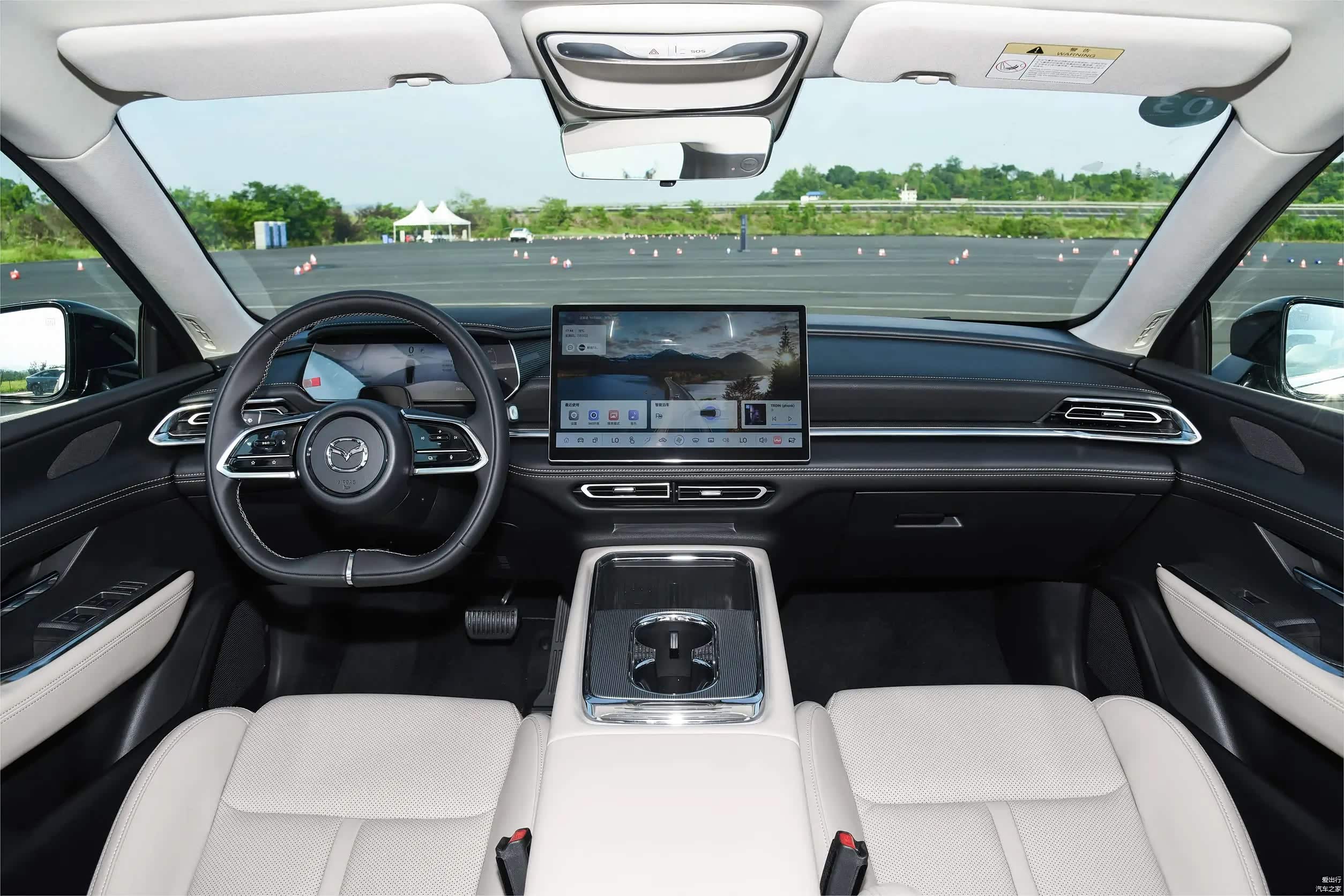 在内饰设计方面,马自达EZ-6同样采用了当下新能源车型的主流设计元素。中控台采用了T字形对称布局,整体风格简约而温馨。多数配置都可以通过14.6英寸的悬浮式大屏进行操作,这块大屏内置了高通8155芯片,性能强劲,操作流畅。搭配10.1英寸的全液晶仪表和两幅式平底方向盘,整个内饰充满了科技感。顶配车型更是配备了50英寸的HUD抬头显示功能,让驾驶者在行车过程中能够更加方便地获取车辆信息。同时,电子怀档的设计也让原挡把区变得更加整洁,取而代之的是一个50W的手机无线充电面板和两个水杯架,既节省了空间又提升了内饰的实用性。