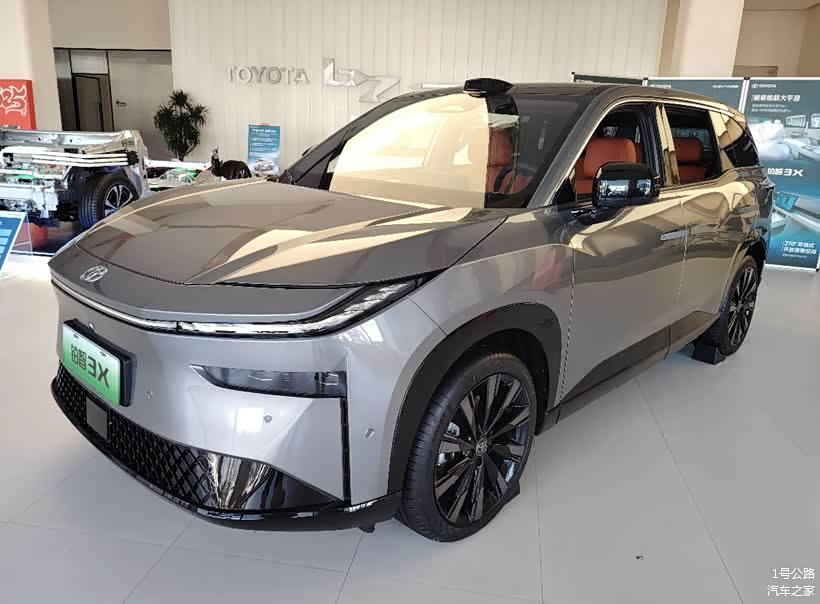 从外观设计上看,铂智3X延续了丰田bZ序列的家族式设计语言,整体造型硬朗大气。前脸采用封闭式格栅,搭配分体式大灯组,上方为贯穿式设计,下方则与引擎盖两侧的隆起线条相呼应,营造出犀利的视觉效果。车身侧面线条流畅,分段式腰线与前后轮眉、侧裙处的硬朗线条相互映衬,形成出色的光影效果。B/C柱和车顶采用亮黑色处理,形成悬浮式车顶的视觉效果,进一步提升了整车的时尚感。