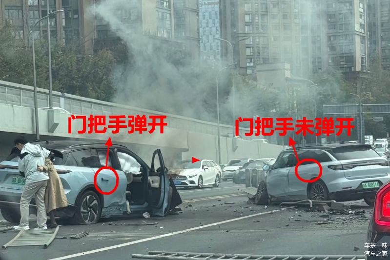 零跑C11的第二个缺点,就是在碰撞发生后,隐藏式门把手没有弹开!反观旁边的蔚来ES6,它在碰撞之后,隐藏式门把手正常弹开,为施救提供的便利。