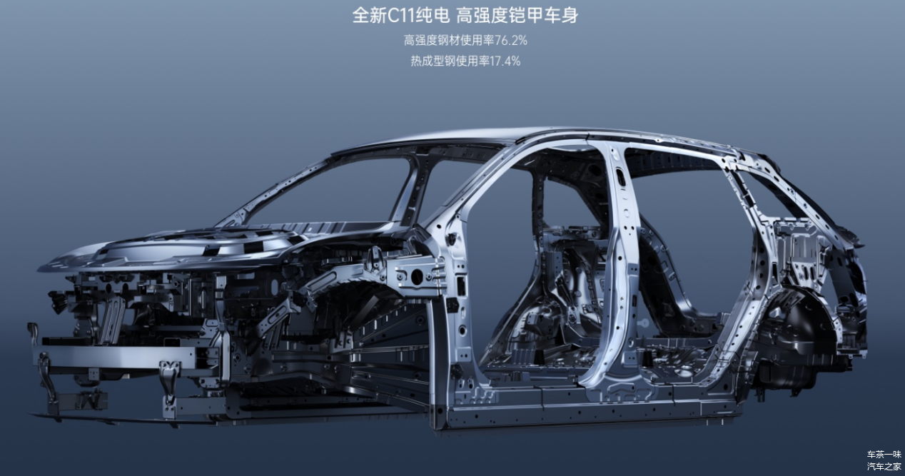 第一个,就是A柱断裂的问题。我在之前接触过不少次零跑C11,而且在官方资料中显示,零跑C11整车高强度钢使用比例达到了76.2%,其中热成型钢占比17.4%。
