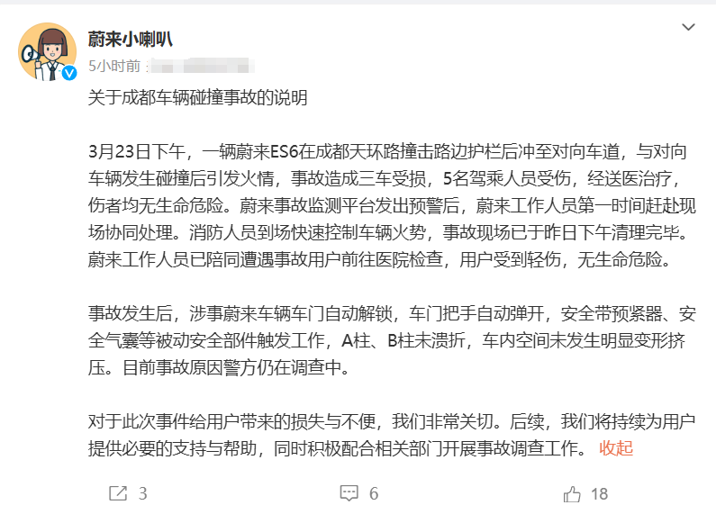 蔚来汽车官方辟谣号对此回应,共5名驾乘人员受伤,经送医治疗,伤者均无生命危险。蔚来事故监测平台发出预警后,蔚来工作人员第一时间赶赴现场协同处理。消防人员到场快速控制车辆火势,事故现场已于昨日(3月23日)下午清理完毕。蔚来工作人员已陪同遭遇事故用户前往医院检查,用户受到轻伤,无生命危险。
